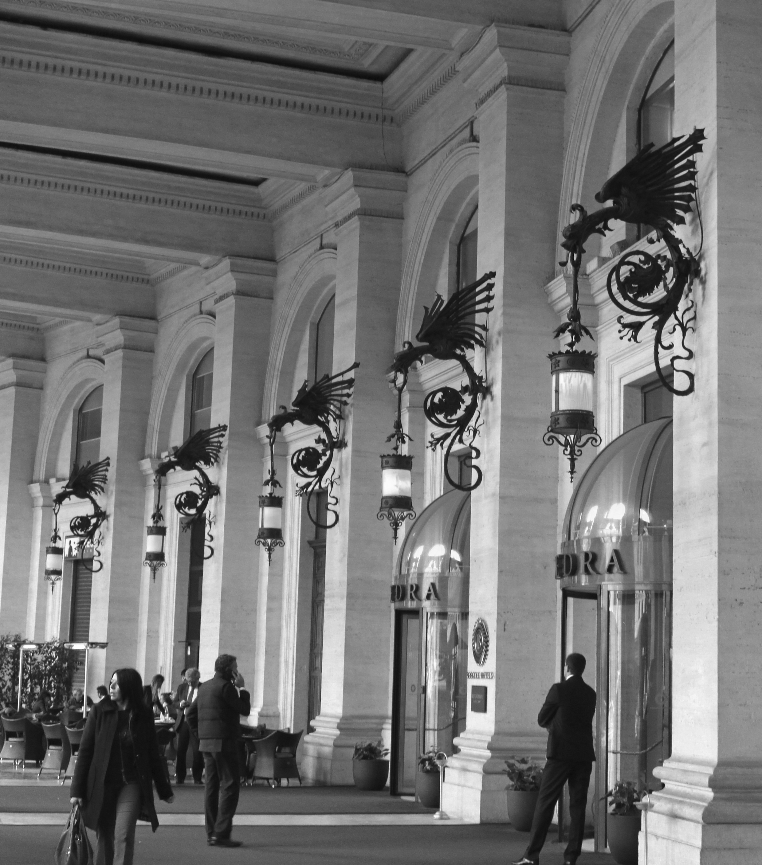 При переводе изображения в черно-белый формат сместились акценты: взгляд не притягивают желтые огни фонарей и окон и красные подушки на креслах, он цепляется за интересные держатели фонарей и фигуры людей. Кадрированием убрала лишние фигуры, стойку меню, немного потолка и самый крупный фонарь, чтоб не отвлекали, чтобы оставить более "чистый" кадр. За исключением "обрезанных" ног женщины результатом довольна.