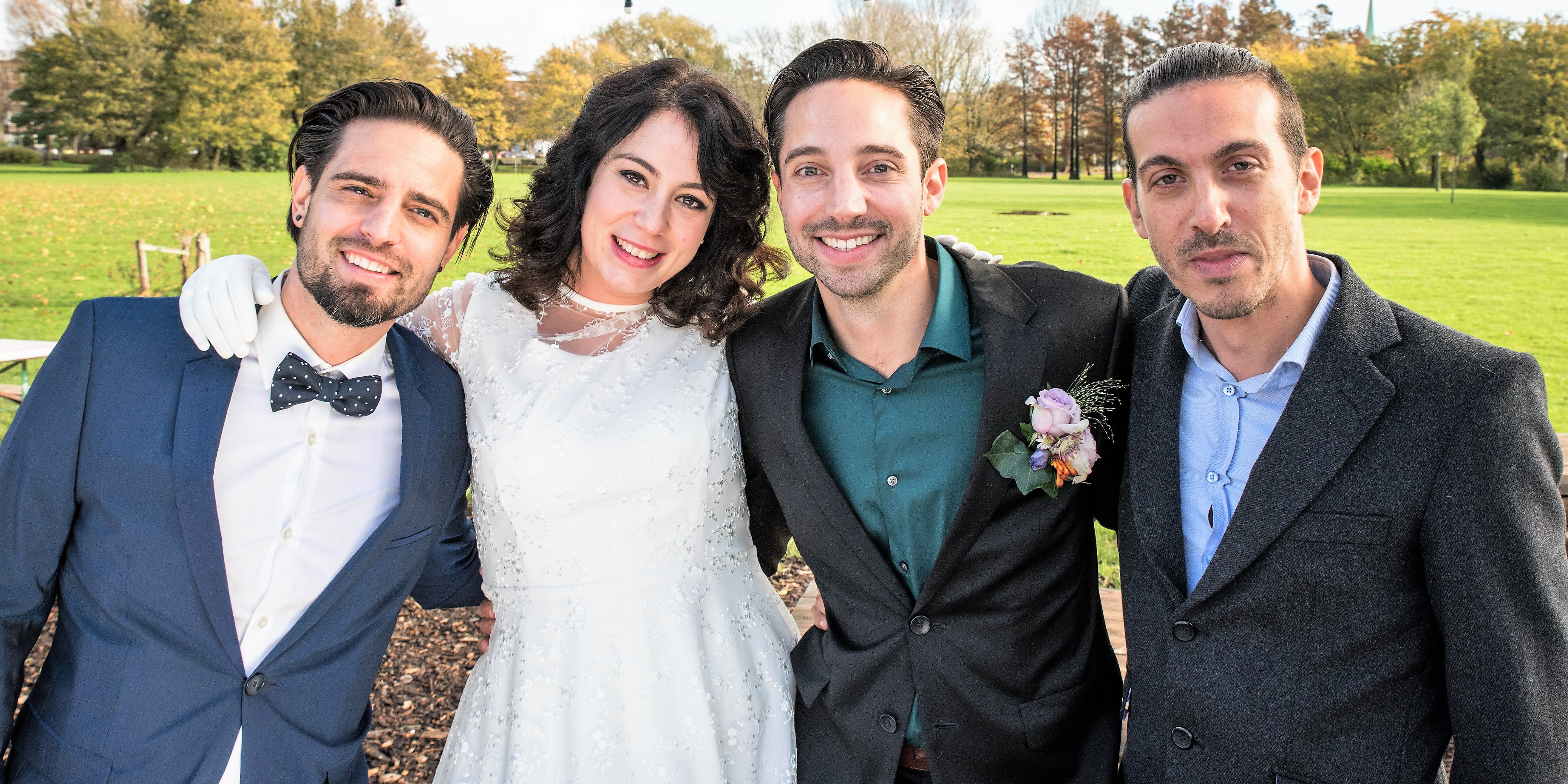 Главные персонажи свадьбы с родными братьями жениха по совместительству - свидетелями. Использовал репортажную вспышку с софтбокосом " в лоб" и рефлектор слева-сбоку.