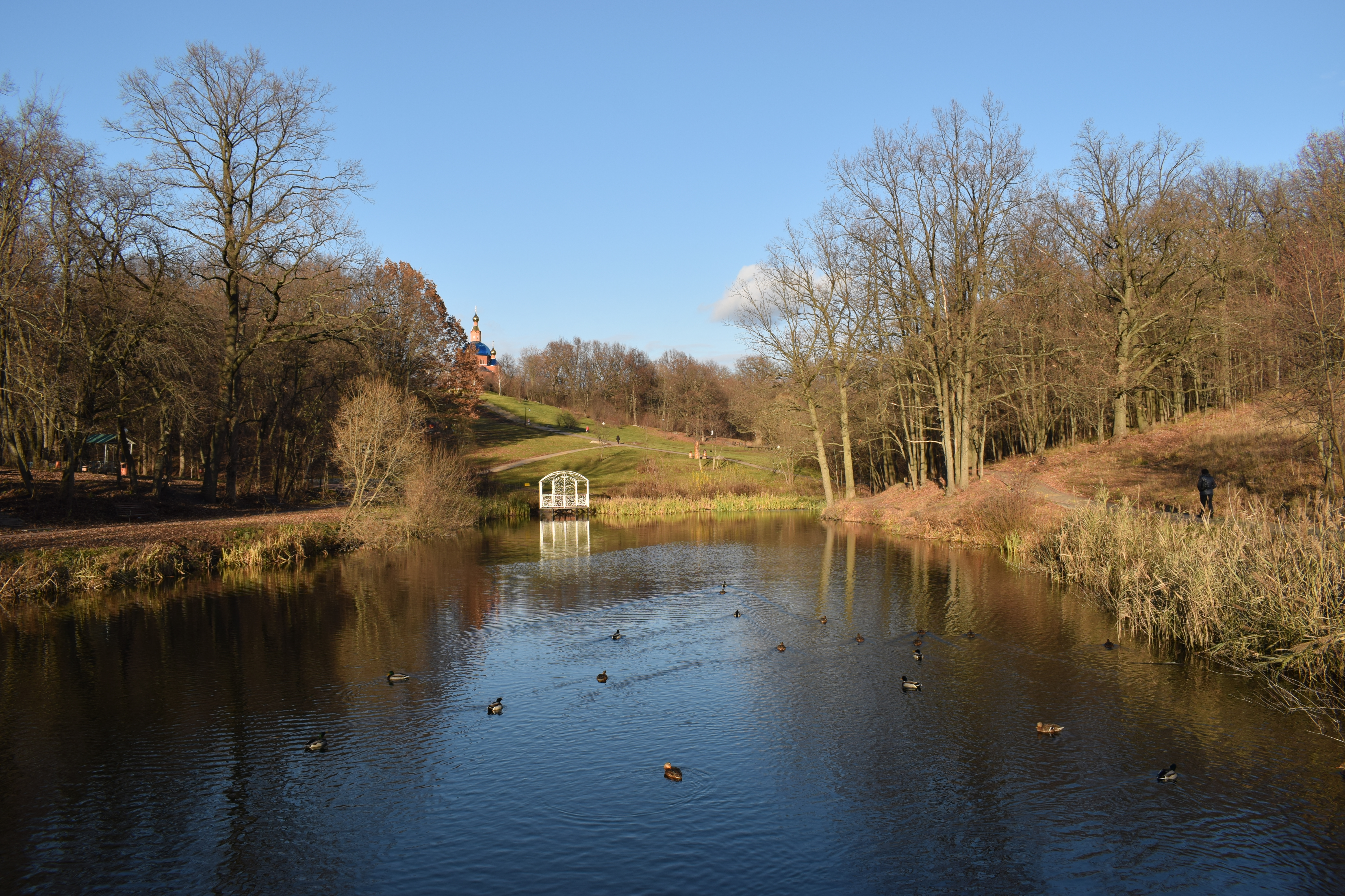 Баланс белого устанавливала согласно облачной погоде, поэтому фото получилось теплым. Ненадолго вышло солнышко, за счет чего цвета стали насыщеннее. Многоплановость присутствует. Диафрагму не стала больше прикрывать, могло поползти вверх ИСО. Выдержка короткая, на переднем плане плавающие утки, съемка с рук.