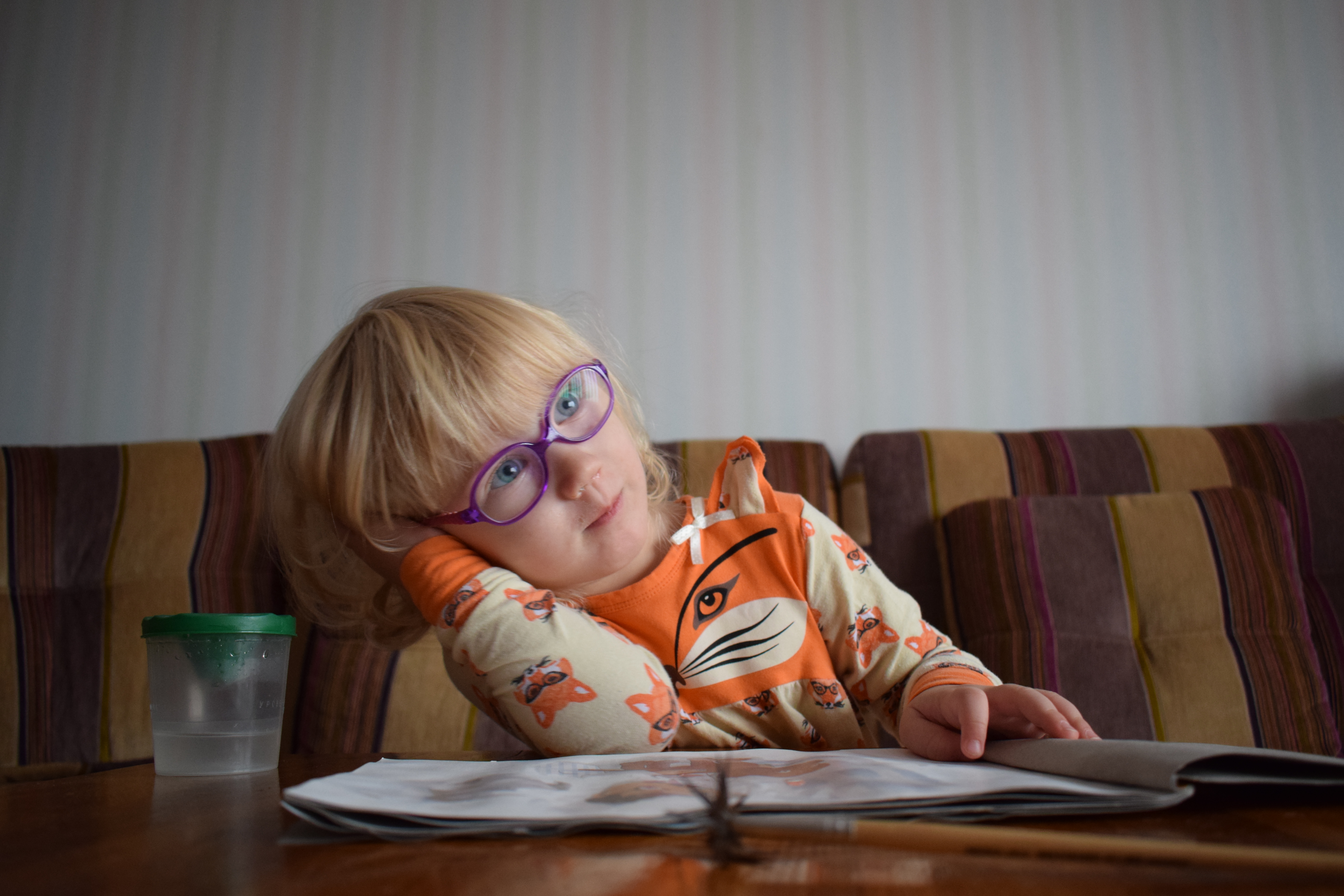 пофотографировала дочку за любимым делом - за рисованием. Этот кадр показался интереснее тех, где она занята непосредственно рисованием - тут она немножко улыбается и как будто думает о чем-то приятном.