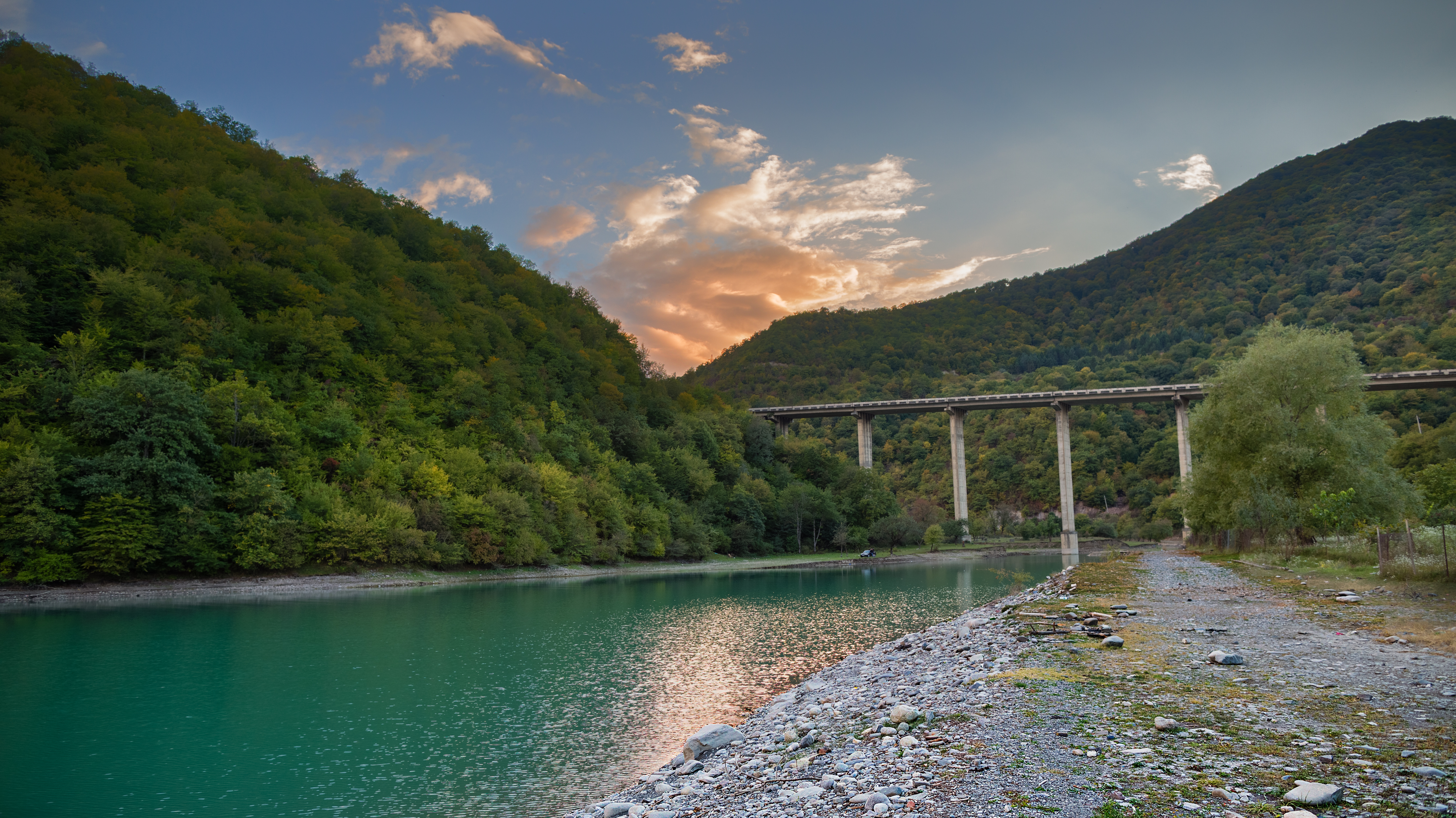 Дмитрий, Добрый день! В общем переделал кадр полностью. За основу взял тот же dng файл, полученный при помощи функции Photo Merge. Ореолы над деревьями в предыдущей версии возникли из-за неряшливо сделанных масок кривых. Переделал их полностью. Равно как и сами кривые. Попытался увеличить общую контрастность снимка при помощи локального применения кривых. Для придания фотографии объема попытался сделать следующее: 1. Кадрирование. Границу нижней трети сдвинул к основанию моста. (формат теперь 16:9) 2. Достаточно сильно увеличил резкость камней на переднем плане с уменьшение шарпа далее по градиенту. 3. Добавил виньетирование Очень проблемным местом оказалось стрелка на стыке двух сопок. Там над самыми деревьями и за ними небо серое и при повышении контраста неба это пятно воспринималось как ореол. Маски на максимальном зуме рассматривал. Там похоже не в них дело было. В итоге не придумал ничего лучше как при помощи оранжевого фильтра это серое пятно попытаться приблизить по цвету к оранжевым облакам. В общем не знаю, как это воспринимается теперь :))))