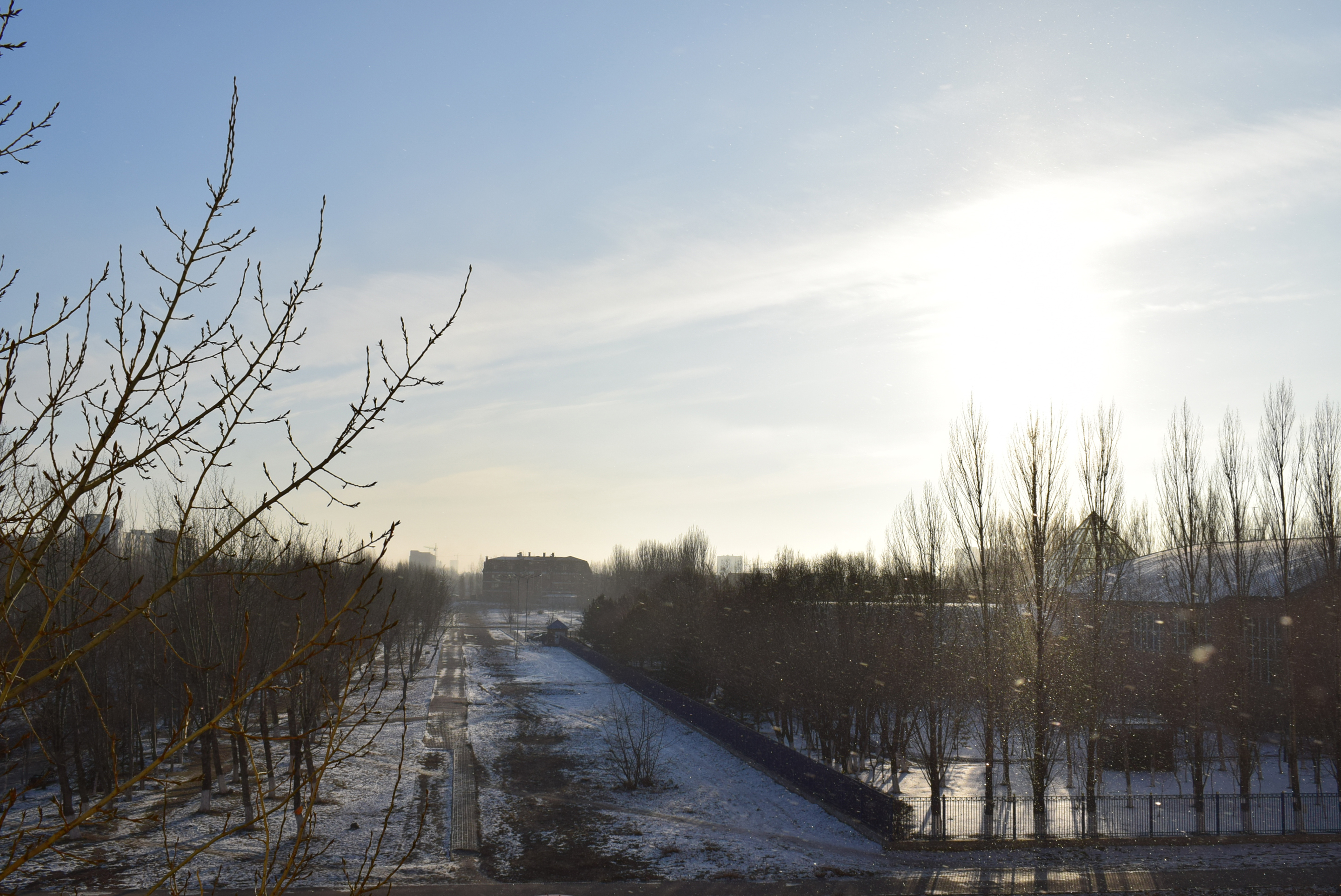 Солнце получилось пересвеченный, работала с экспокоррекцией и встроенными эффектами фотоаппарата. Получилось, вроде, уловить луч, которые подсвечивает падающий снег.