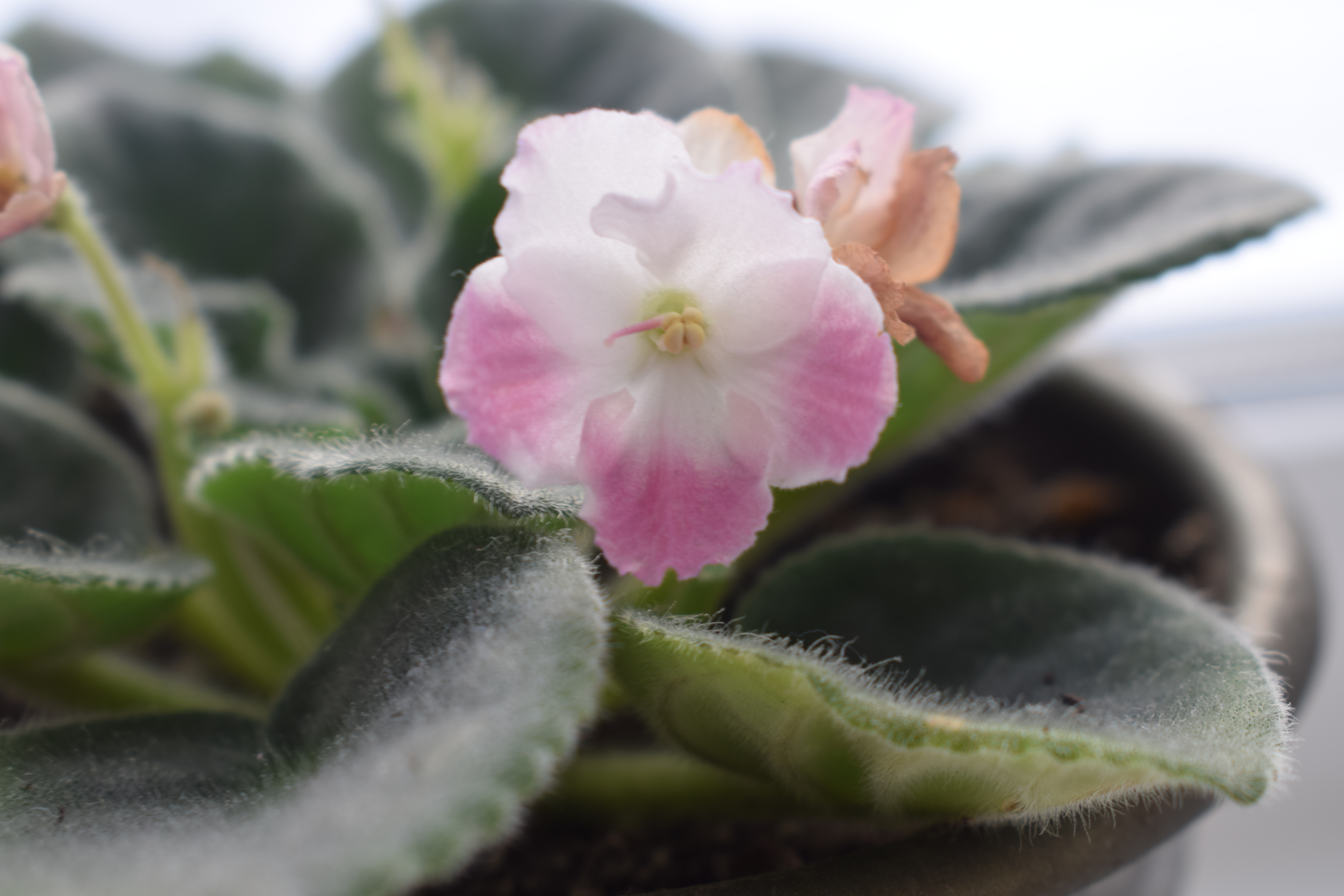 Освещение направлено на него сзади, цветочек отделен от фона . Хорошо прорисованы ворсинки на листочках.