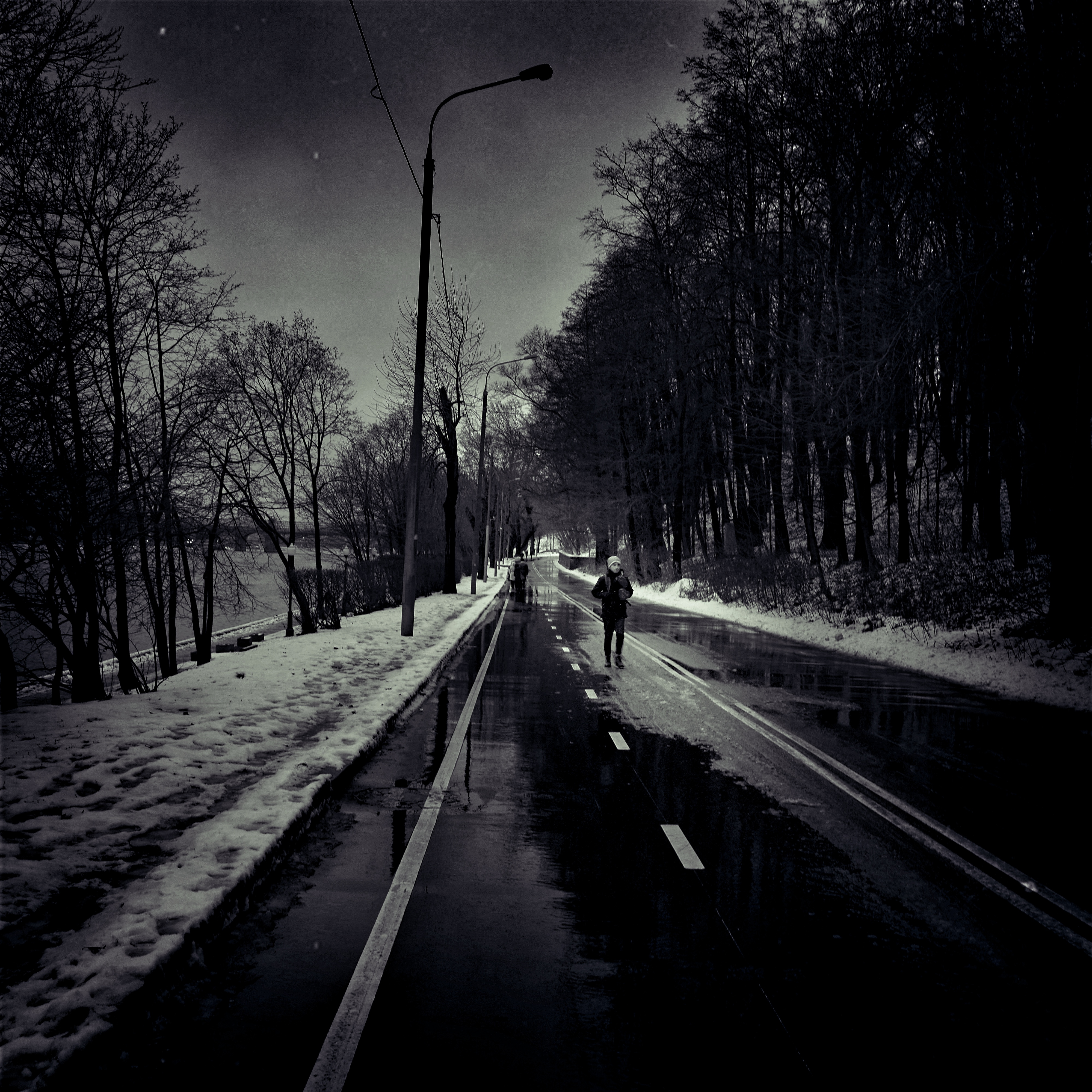 Снимала в ручном режиме - в чб обрабатывала уже на компьютере. Несмотря на темный окрас фотографии стремилась её сделать максимально не мрачной: главный герой, мальчик, идет домой, дорога впереди него освещена (в контрасте с тенями по бокам от дороги) - все хорошо.