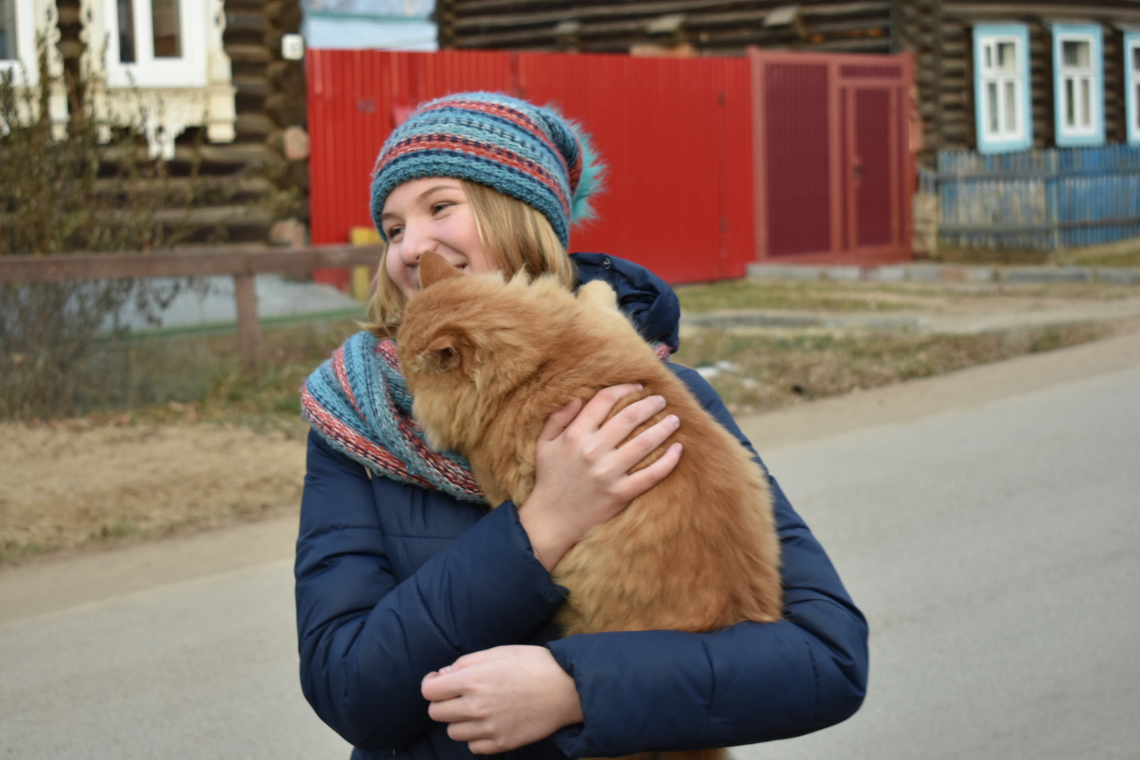 Прекрасная юная леди не может устоять при виде уличного кота. Так и хочется взять, погладить, приласкать бродягу.