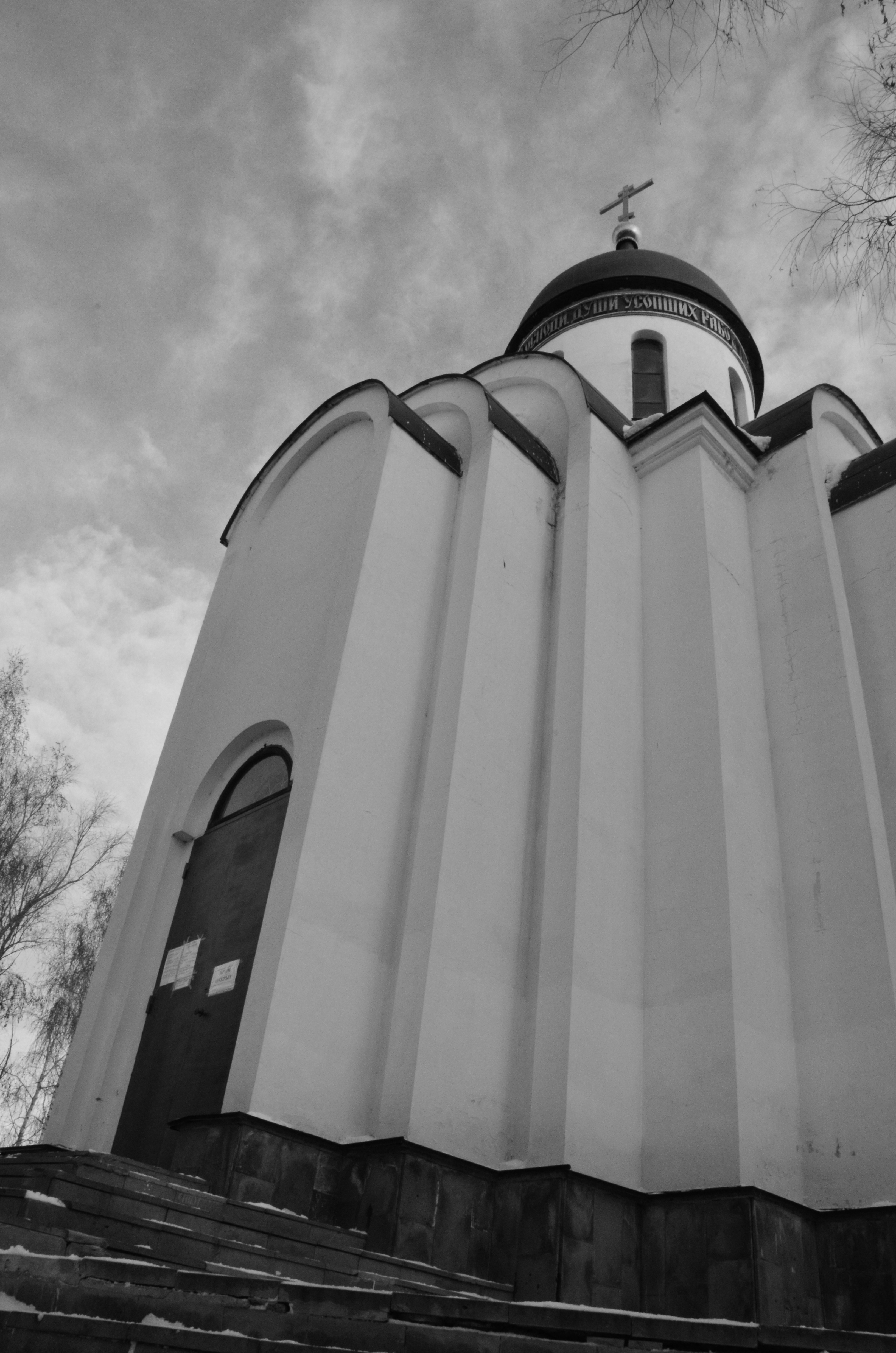 С нижней точки съемки храм выглядит большим, значительным. Он устремляется в небо.