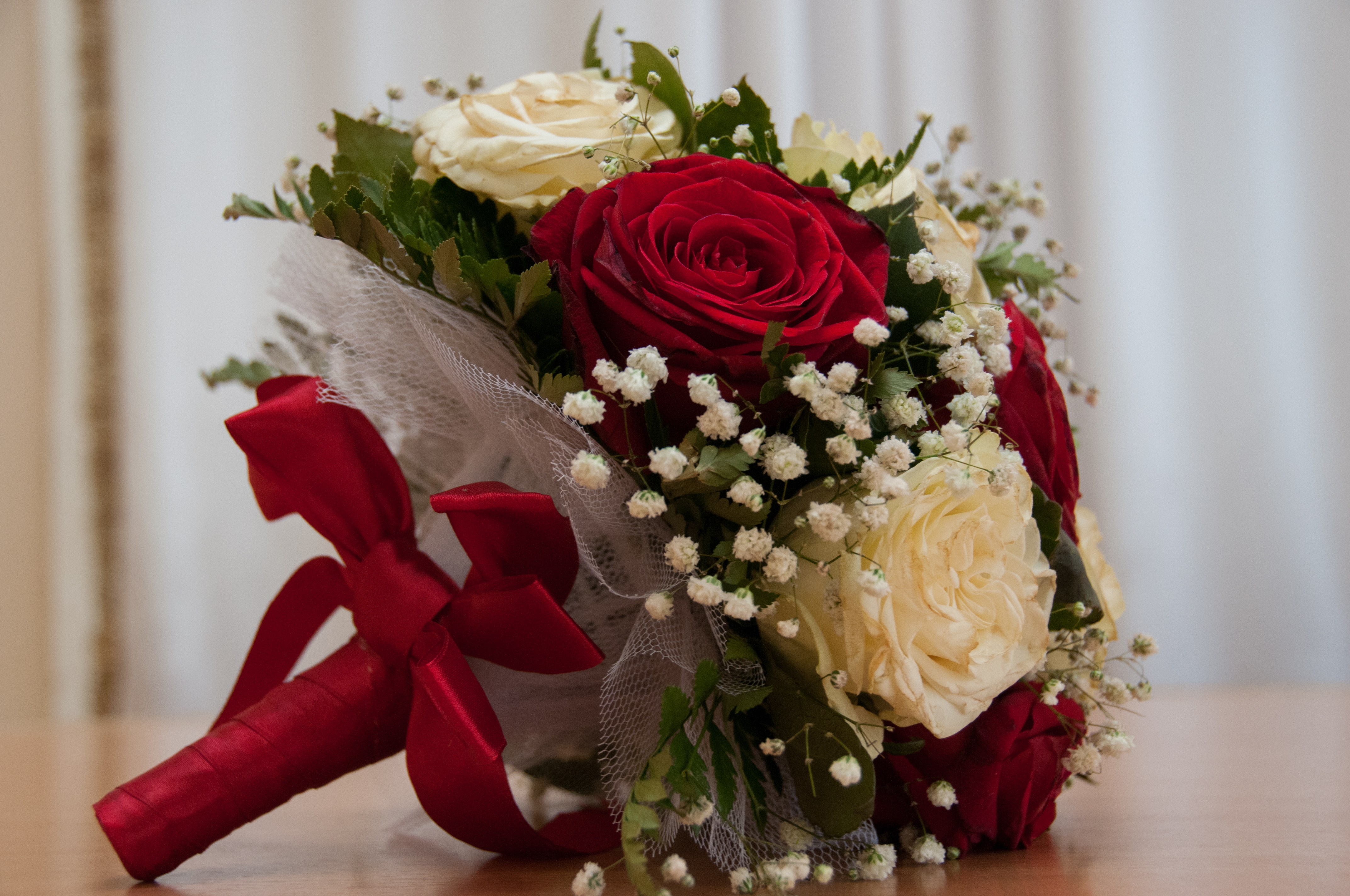 Крупноплановая съёмка позволила преподнести букет достаточно выгодно. Вспышка заполнила тени и помогла избежать слишком затемнённых участков. Фон гармоничный, без отвлекающих деталей, так что всё внимание зрителя устремляется именно к букету.