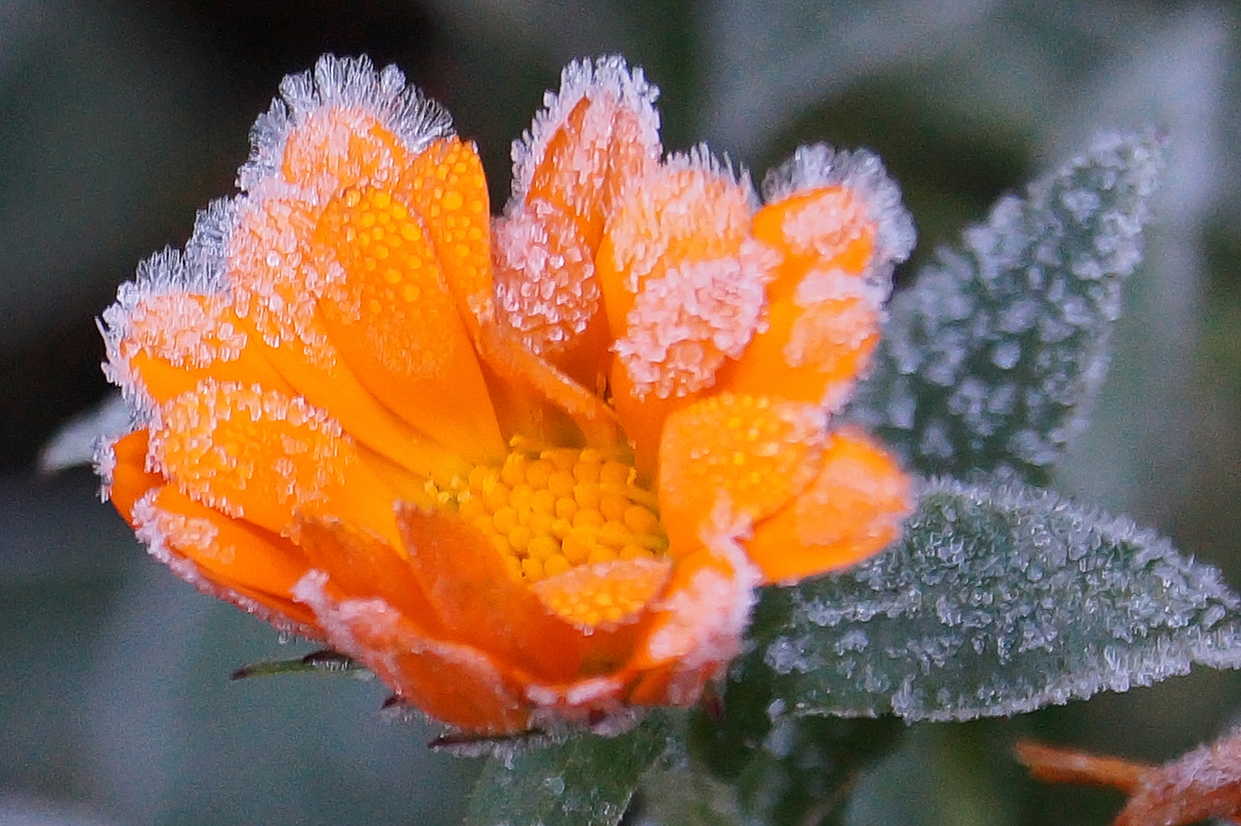 Нежный, красивый цветок скован инеем. Противопоставление красоты, нежности и холода, мороза.