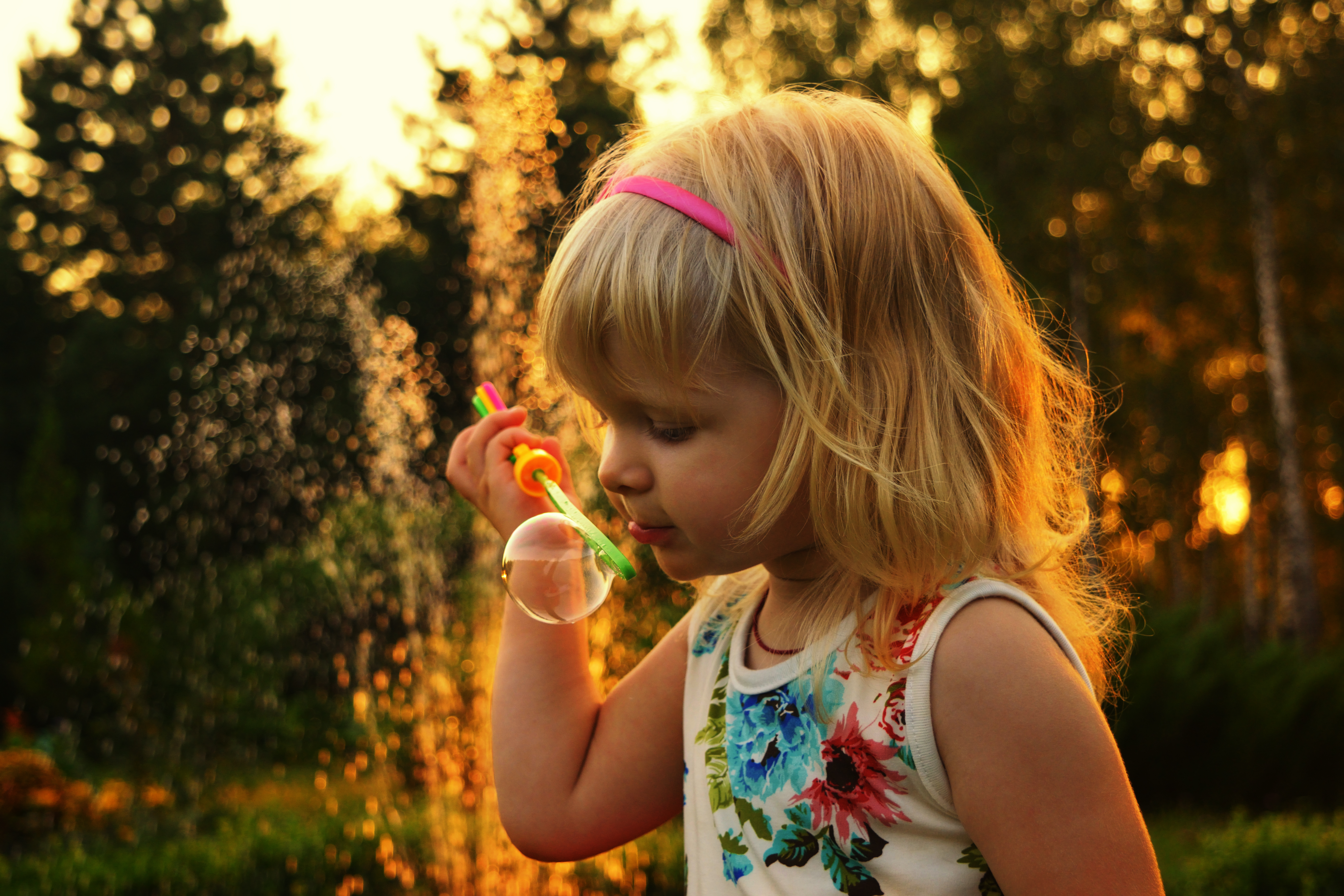 Освещение направлено сзади, девочка отделена от фона, красиво прорисованы волосы и выделен мыльный пузырь.