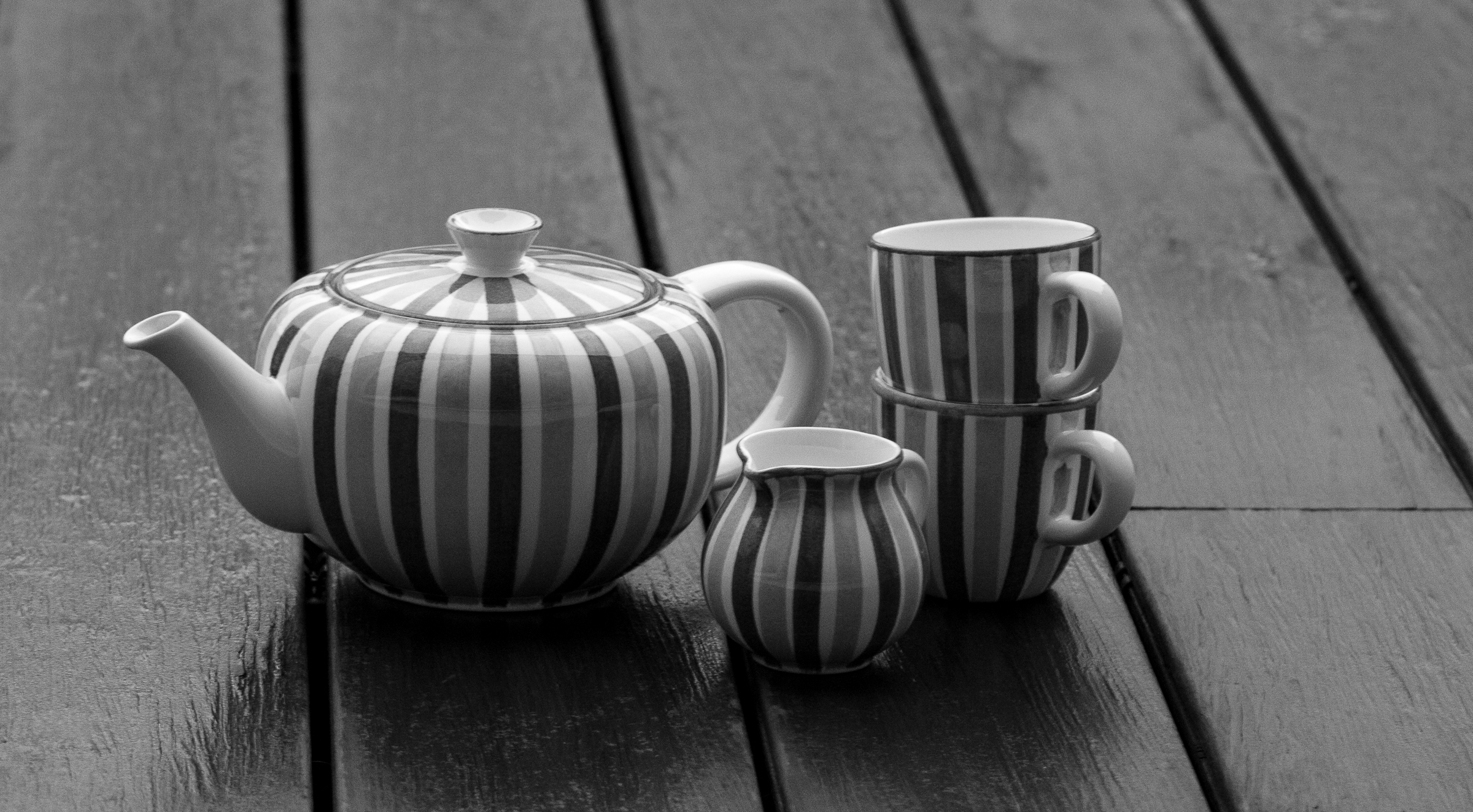 В монохромном варианте сюжет выглядит достаточно выигрышно. Усилен акцент на текстуре, подчёркнуты детали. Полоски на чайном сервизе перекликаются с полосками досочек. Так что в кадре присутствует ритм и перекличка) Лаконичный и гармоничный сюжет получился. Удачно выставлено освещение и грамотно выбраны настройки.