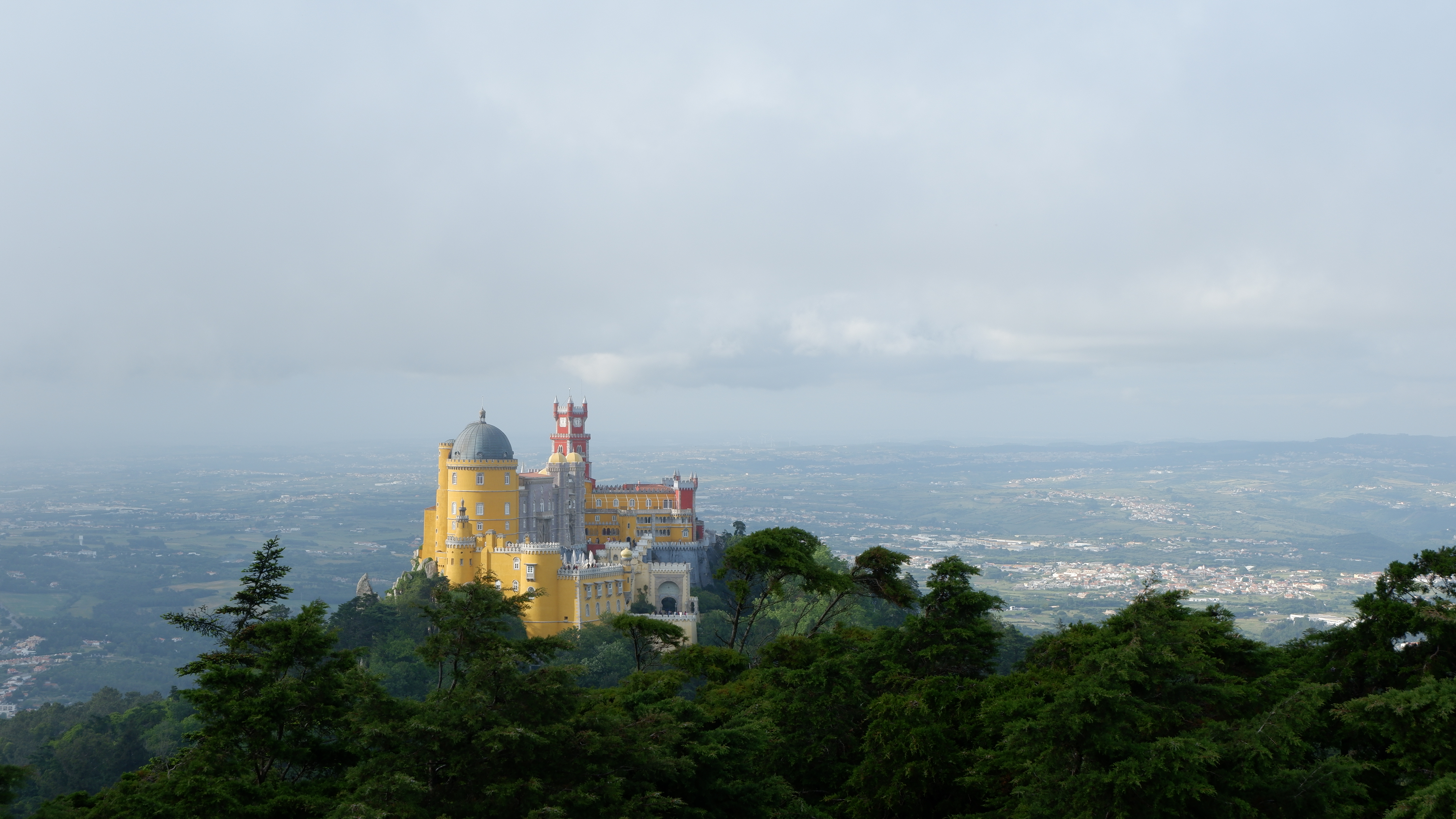 Рублевка под Лиссабоном - Синтра, Замок Пена. Безусловно, это здание заслуживает съемки телеобъективом. Зато (у меня его нет), в отличие от стандарта, я акцентировал внимание на "эффекте полета" =) Может показаться, что горизонт слегка завален влево, но нет - слева холм, плавный и выше, чем слева. Ну и по самому замку видно