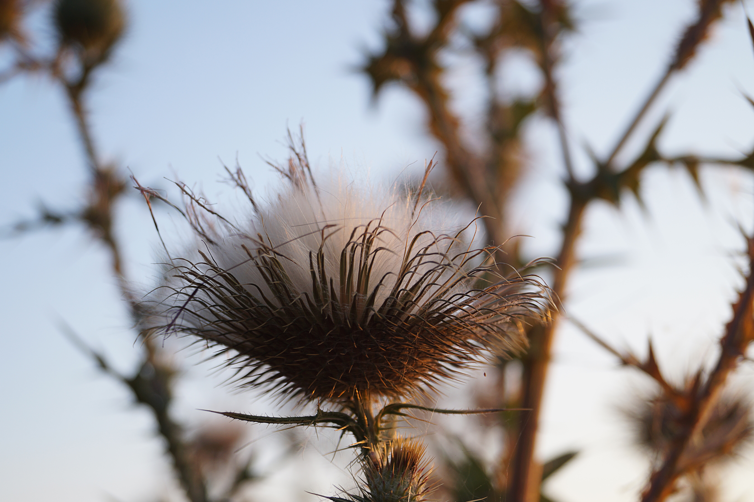Этот кадр я назвала "Нежность". Даже невзрачная с виду колючка может быть нежной, красивой и грациозной. Как снять :) . Фото сделано в золотой час, на закате. Свет так выгодно падает и подсвечивает пушок, что он смотрится объемно и напоминает облачко.
