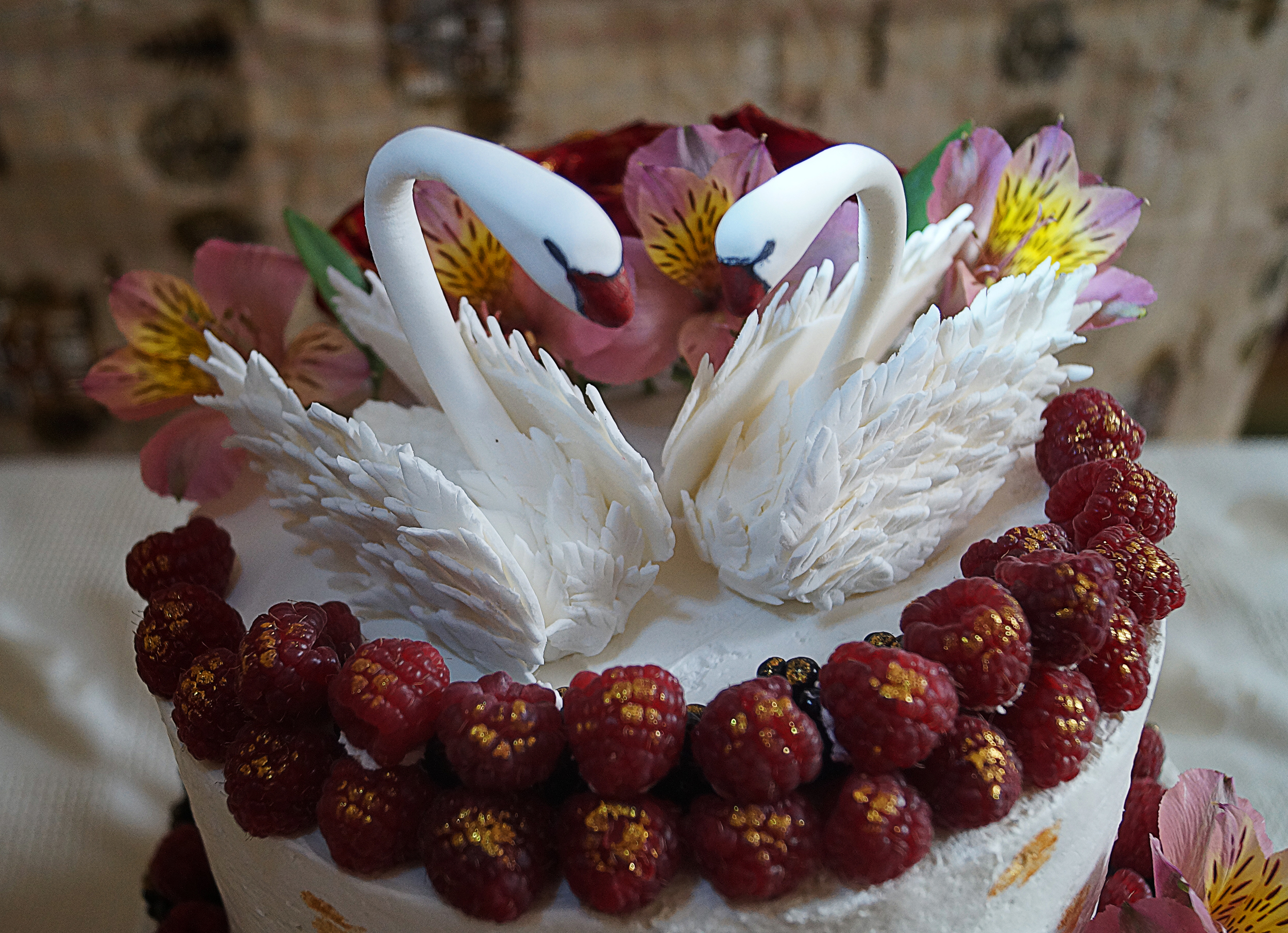Свадебный торт. Свет сакцентирован на сахарных лебедях. Подсвечивали двумя фонариками с разных сторон.