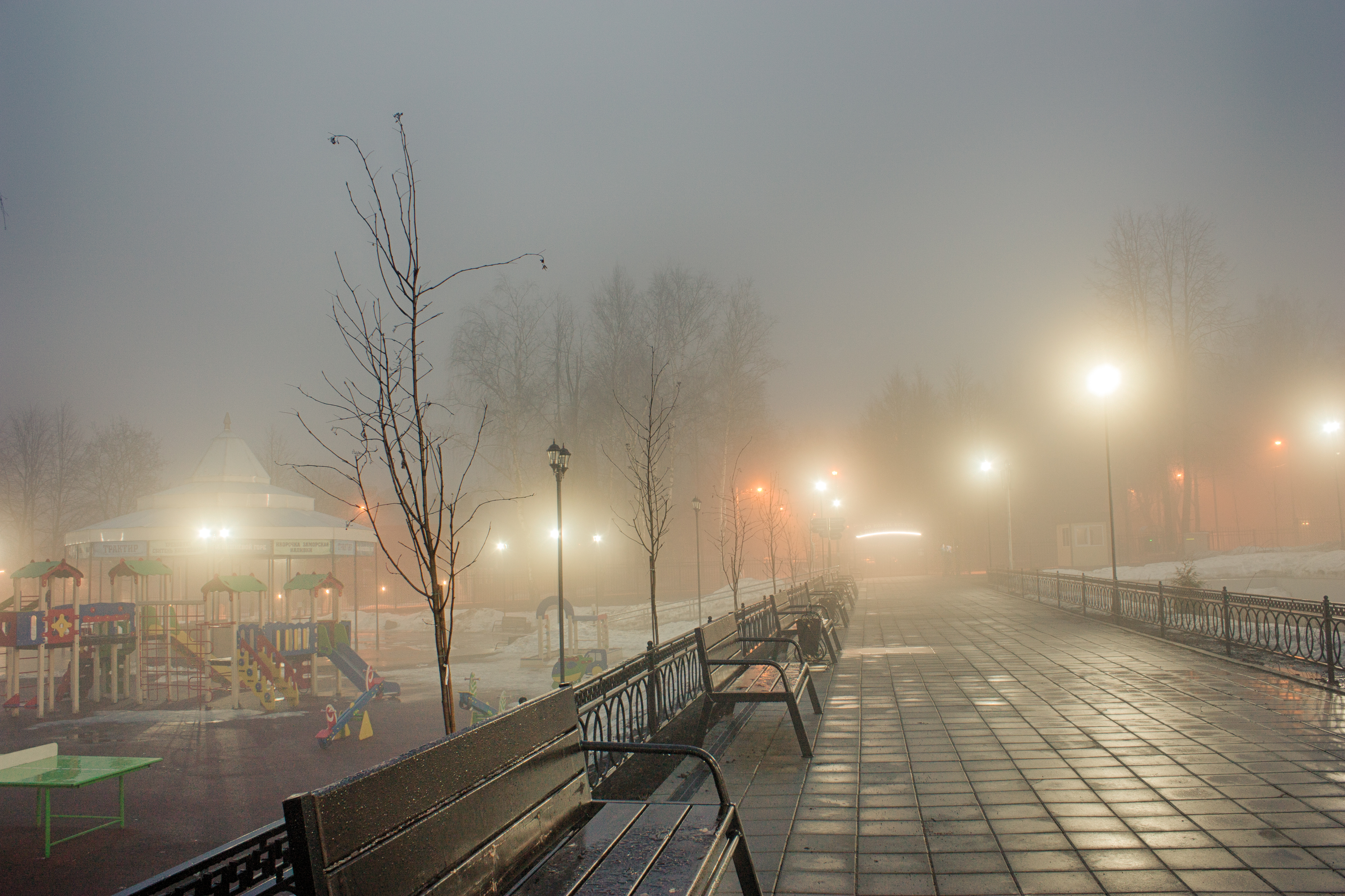 Ночной парк в тумане. Сделал теплый свет, перспектива в светящуюся арку. "Ламповый СайлентХилл" )