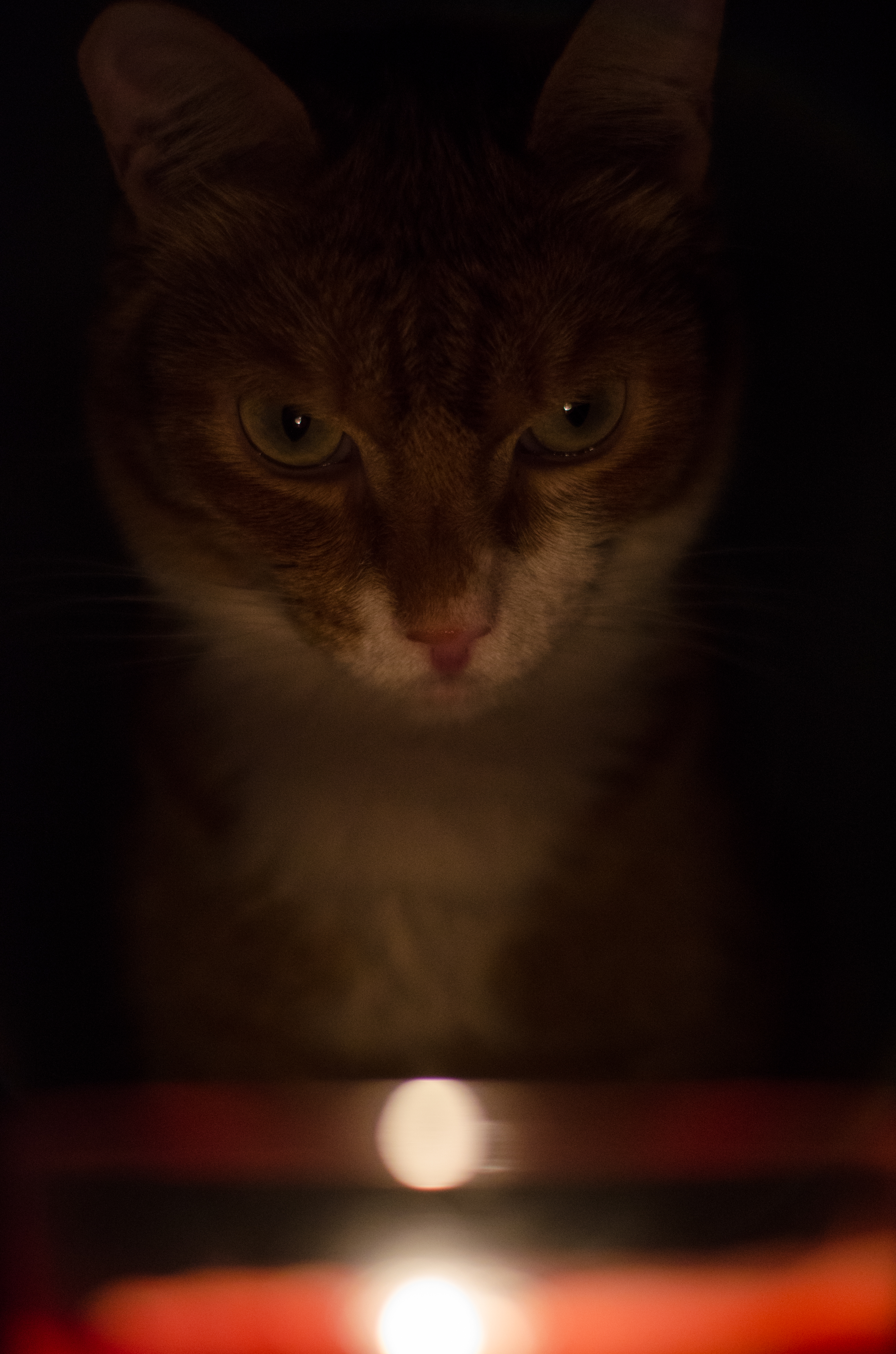 Камеру точно сфокусировали на глаза котика. Диафрагма приоткрыта и глубина резкости получилась маленькая, размытый фон усиливает внимание на портрете.