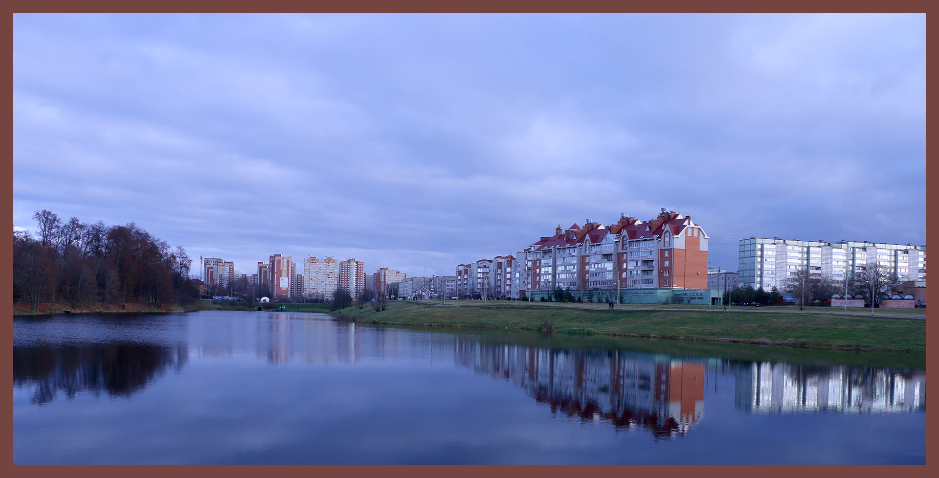 Добрый вечер! Был пасмурный день, на короткое время выглянуло солнце - понравилось отражение зданий, очень четкое. Кадрировала, с тем чтобы линия горизонта сместилась ниже средней линии кадра, применила обводку, используя цвет стены из кадра.