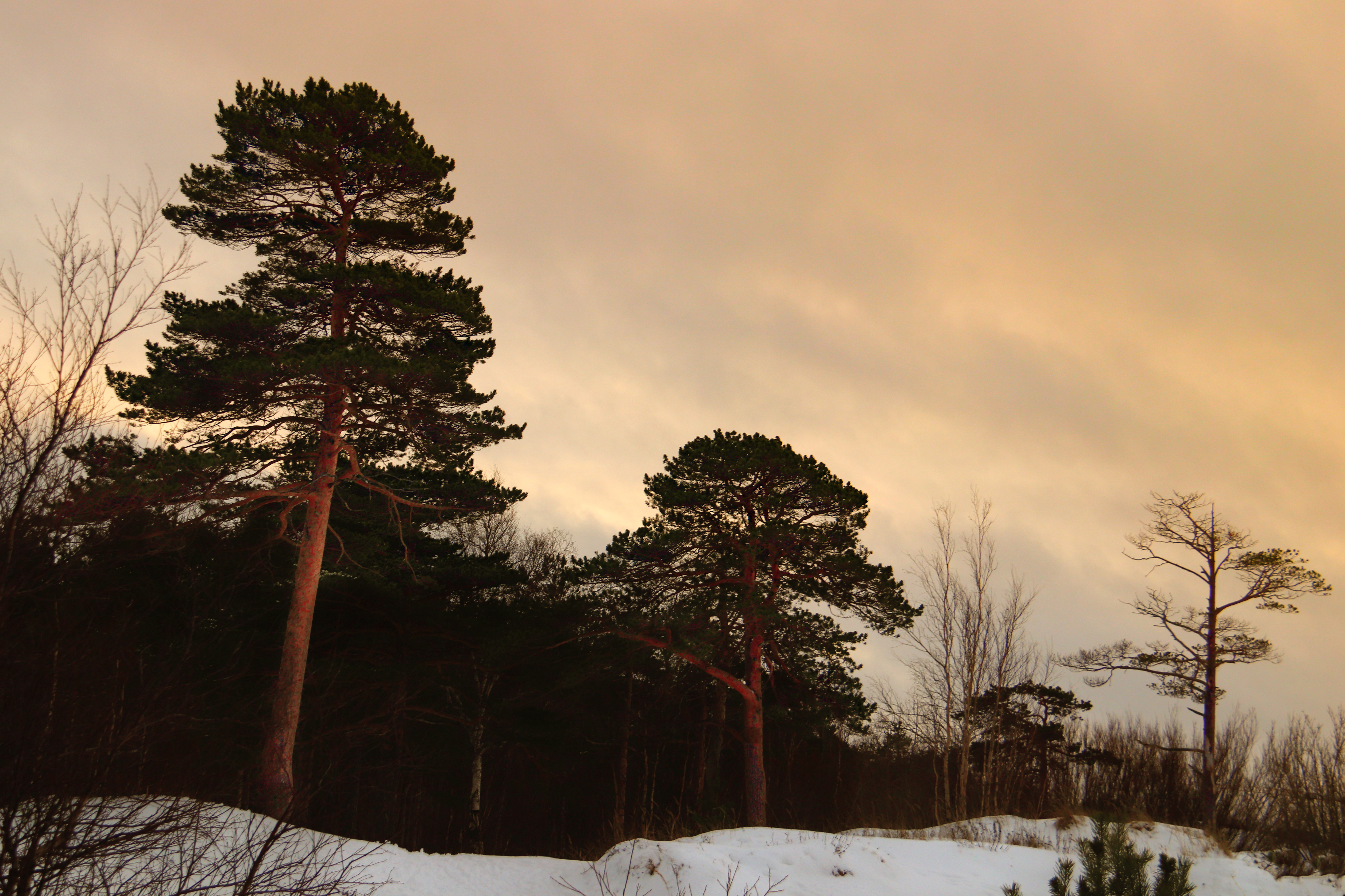 Добрый день!На снимке - сосновый бор на берегу Белого моря. Съемка произведена со снижением экспозиции (из-за белизны облачного неба и снега), что в пасмурную погоду привело к излишней затененности снимка. В ходе обработки выполнено кадрирование,, удалены попавшие в кадр фигуры людей, выполнена общая коррекция изображения подбором цвета, а также локальная в Raw - теплый градиент, повышение экспозиции объектов переднего плана в целях создания атмосферы заката