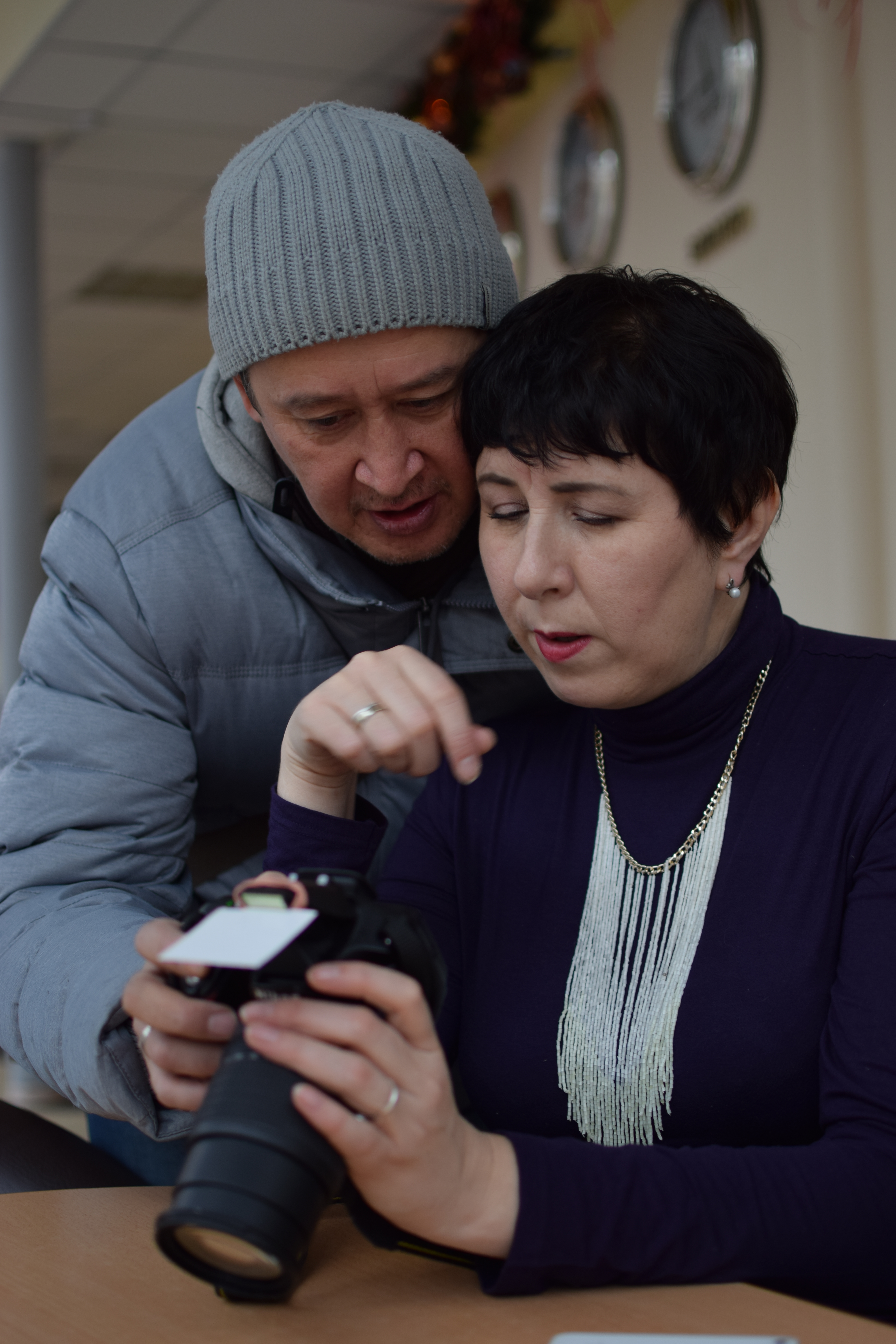 Неплохой снимок! Показали момент обсуждения снимка между двумя людьми. Фокусировка достаточно точная - на лице женщины, хотя диафрагма открыта и глубина резкости очень маленькая. Неплохо разместили моделей в кадре, хотя им немного тесновато.