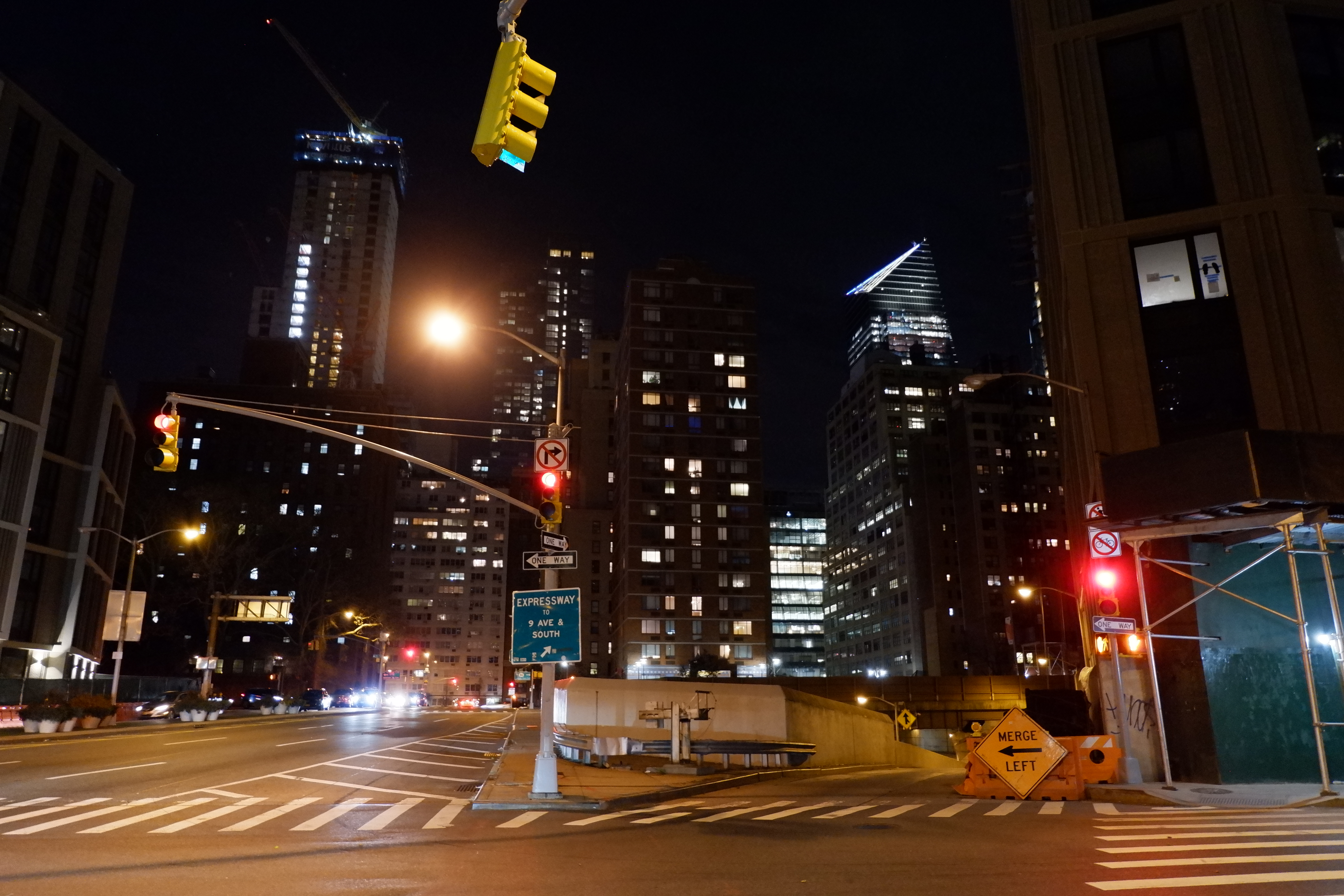 Это ритм абсурда или пьяный ритм: с одной стороны много ритмических элементов (разные дорожные разметки, горизонтально-диагональная линия светофоров, окна в домах). С другой стороны, все эти ритмы сильно разбиваются (зебры преломляются, светофор вдруг "с потолка вылез", улица одна выше, другая - чуть ниже)... Ночной Нью-Йорк. Качество бывало лучше, но это с рук