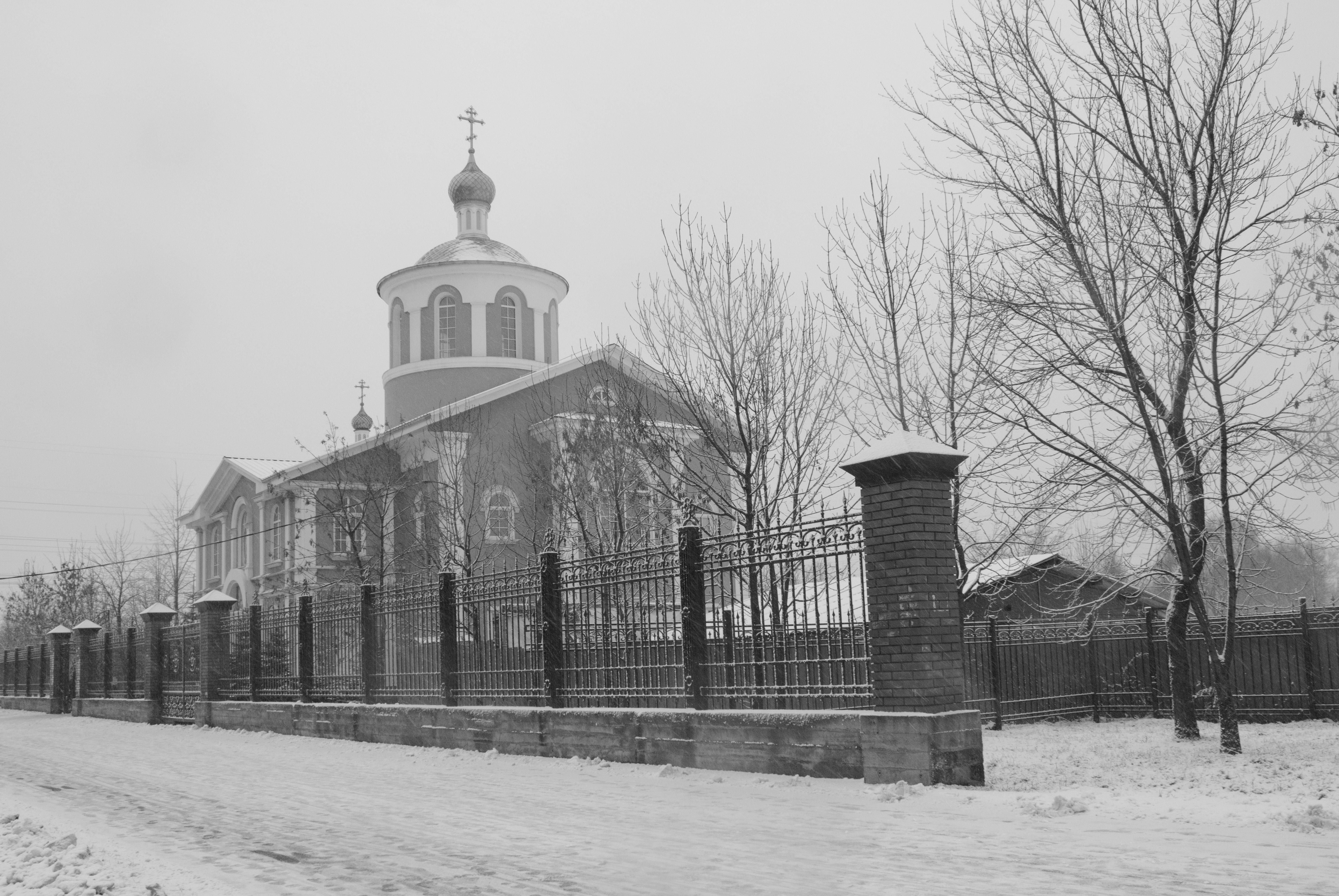 На снимке изображена церковь. Она является главным объектом, поэтому по правилу третей смещена от центра кадра. Ритмичный фон здесь создают деревья, а также элементы ограды. Мне показалось, что в черно-белом варианте этот снимок выглядит лучше (церковь более блеклая, менее реальная что ли). Мне показалось это интересным. Было бы неплохо усилить этот эффект нереальности, но я не умею =))