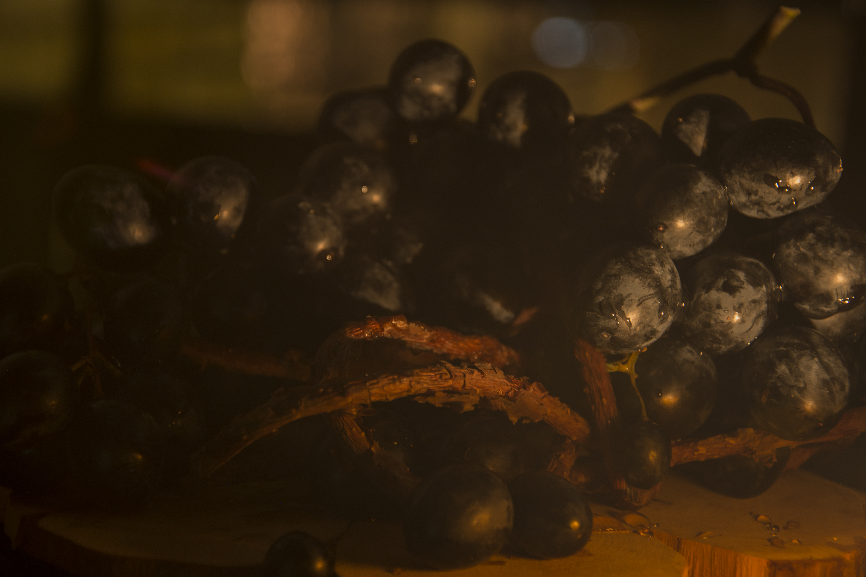 Красивый натюрморт! Хорошо настроен фокус. По композиции расположили виноград выгодно, передние веточки украшают фотографию. Теплый свет от свечи добавляют вечернего уюта. Фото в низком ключе придает таинственности и подчеркивает глубокие цвета.