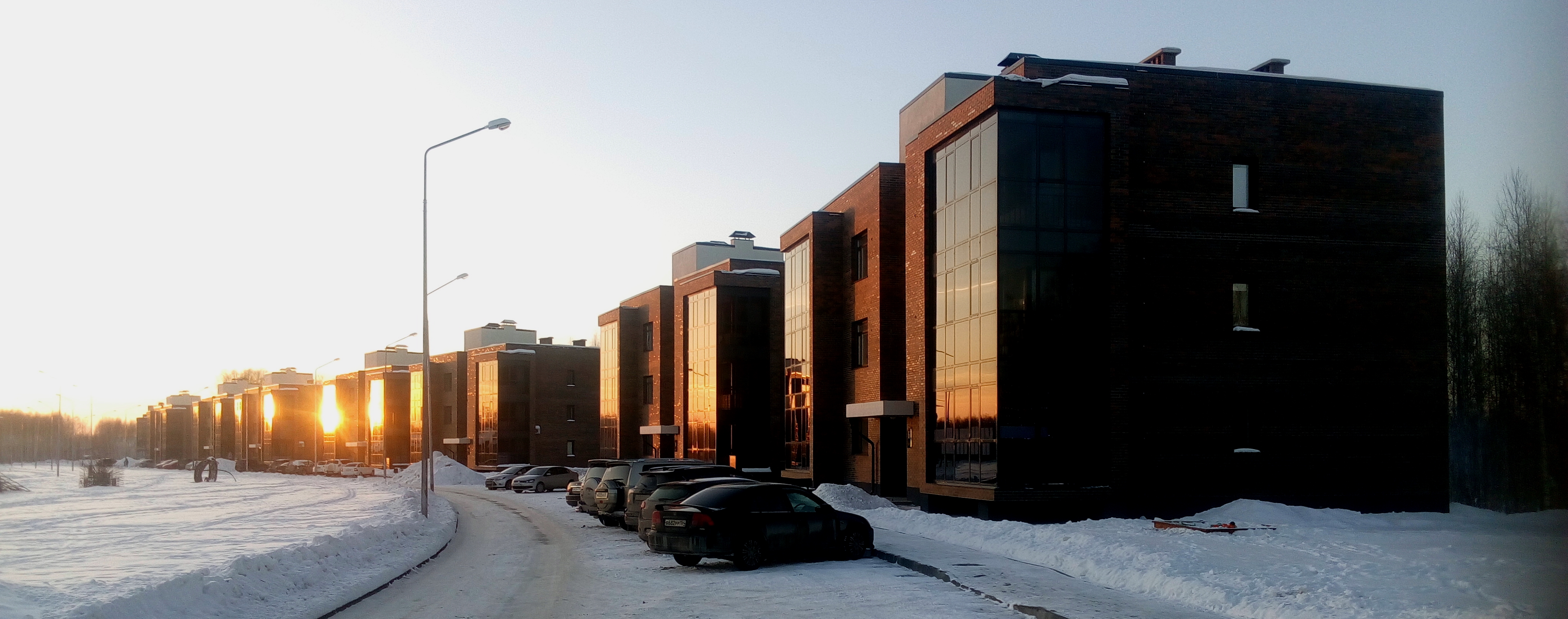 На фотографии светлые и темные участки, их примерно поровну. Мне кажется это создает ощущение встречи дня и ночи. Кадр статичный, как бы замер в ожидании следующего шага - солнце сядет и будет темно, или поднимается выше и добавит света. Солнечные блики и светлые отражения делают темные дома уютнее. Интересное сочетание прямых вертикальных линий и закругленных горизонтальных. Снимок сделан на телефон, не хватает резкости в кадре, хочется, чтобы блики тоже были в фокусе. В целом снимок может показаться мрачным, но для меня он создает ощущение обещания уюта - когда успел вернуться домой до темноты :)