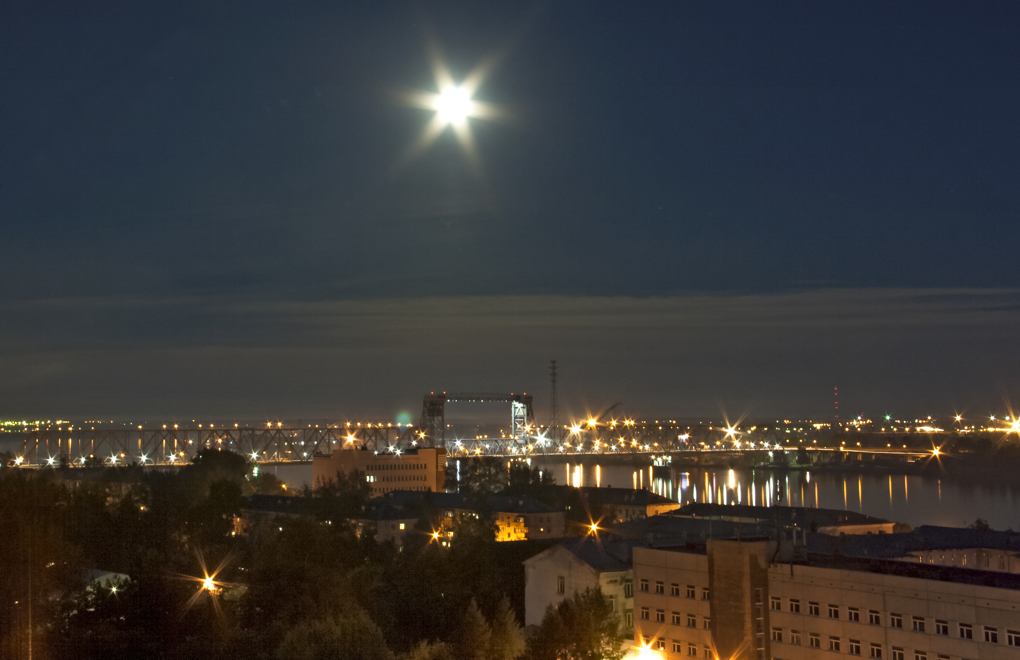 Добрый день! Для выполнения задания выбран снимок ночного города в полнолуние. В кадре "провал" деталей в левом нижнем углу. Выполнено кадрирование, из кадра убраны провода; чуть изменен баланс белого, повышена общая экспозиция (при этом часть неба прикрыта темным градиентом); корректирующей кистью и градиентным фильтром проработаны детали переднего плана, подкорректированы тени в редакторе "Тени-света"
