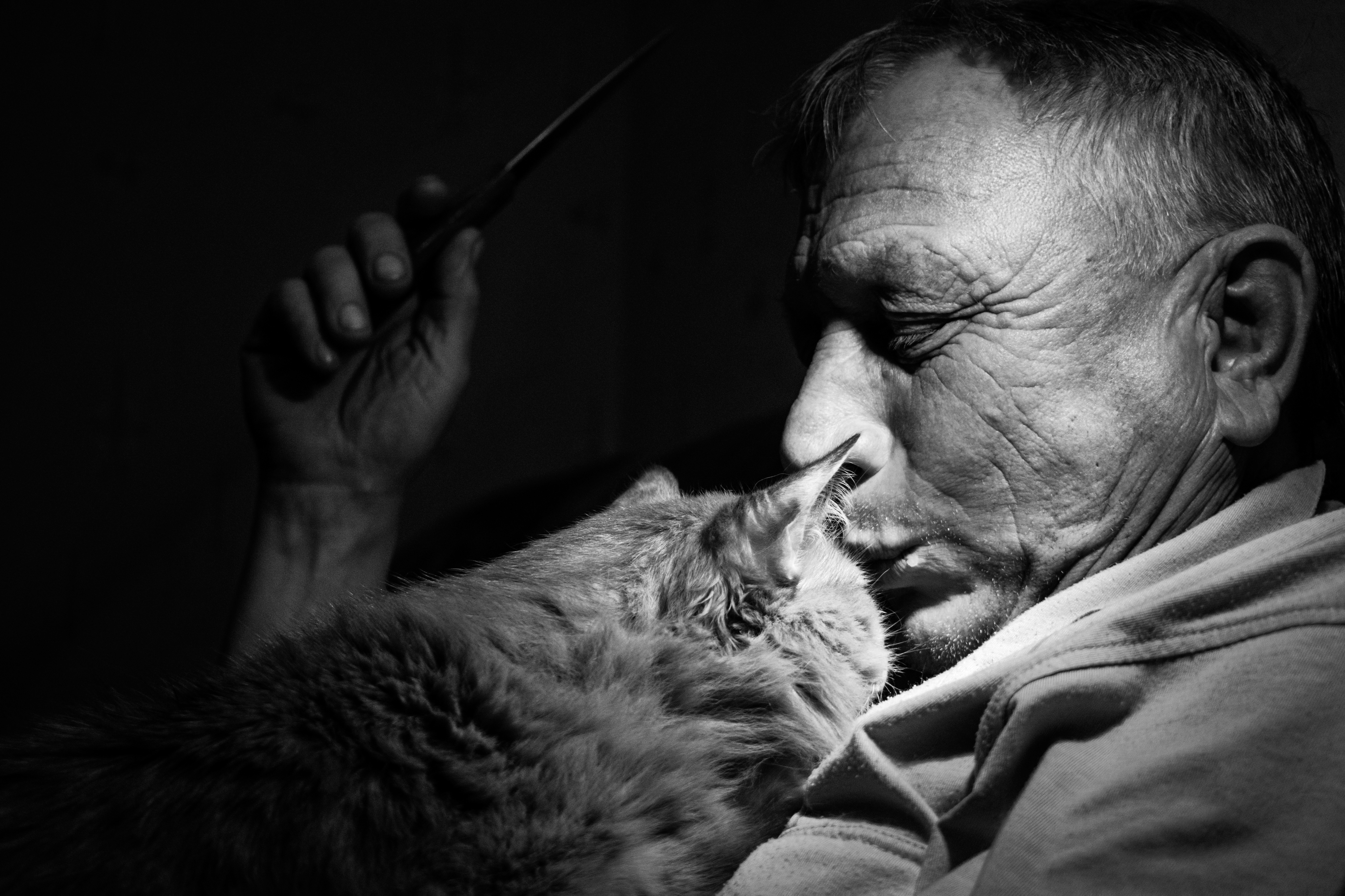 Хороший снимок! Получили очень интересное освещение на фотографии, которое выделило портрет, а фон получился темным не отвлекающим внимание. Свет достаточно контрастный и неплохо подчеркнул лицо мужчины и шерсть кошки. Хорошая резкость и детализация, несмотря на сложные условия освещения. Черно-белый вариант удачно убрал посторонние оттенки цвета от освещения в помещении.