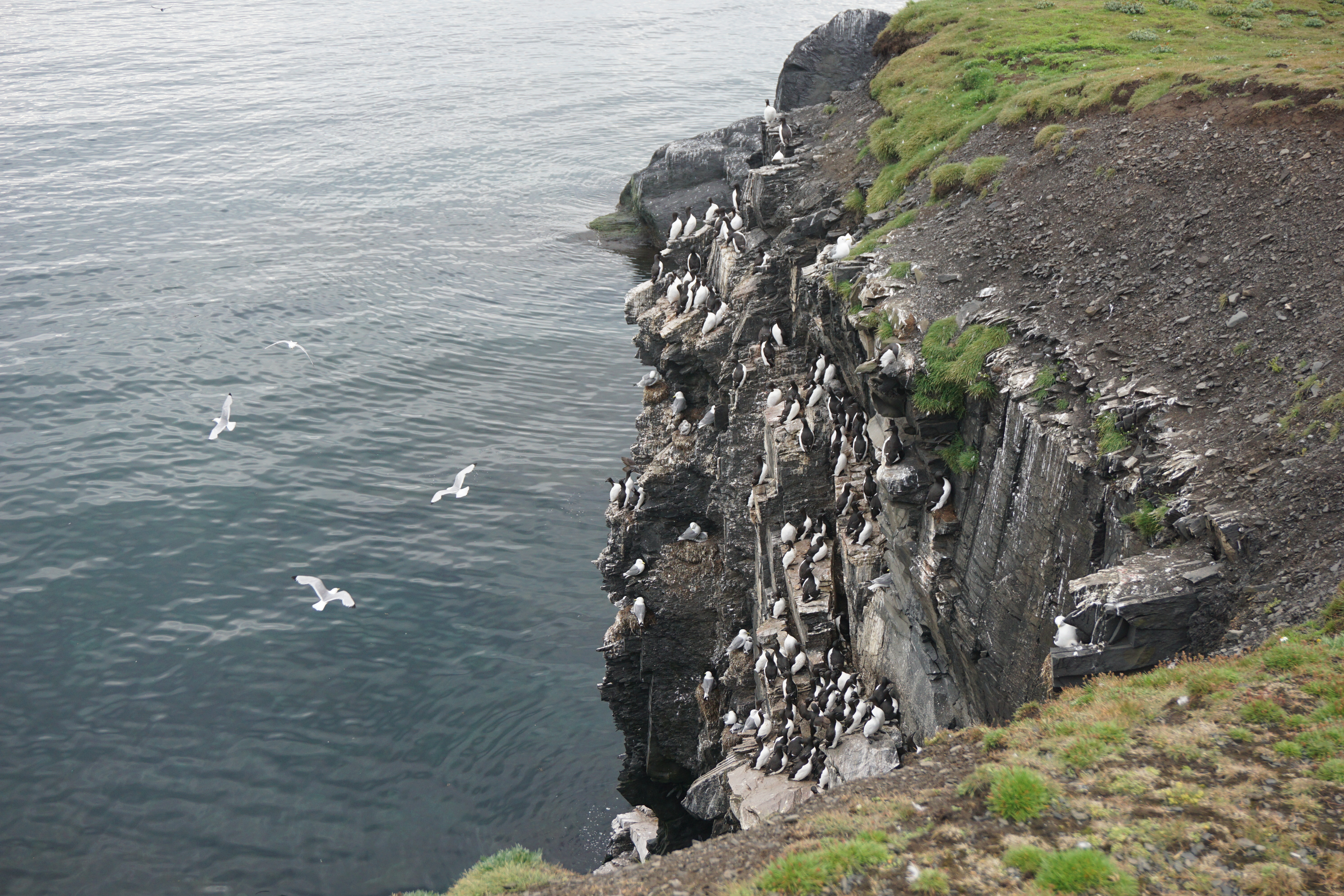 Пейзаж, птичий базар. В кадре создают движение сразу несколько объектов: 1. Что сразу бросается в глаза, кружат чайки 2. Суетятся птицы на скалах 3. Море тоже не спокойно, оно создает ощущение ветра. Пасмурная погода добавляет трогичности кадру, создается ощущение севера за счет холлдных оттенков. Также в кадре чувствуется некая возвышенность и свобода