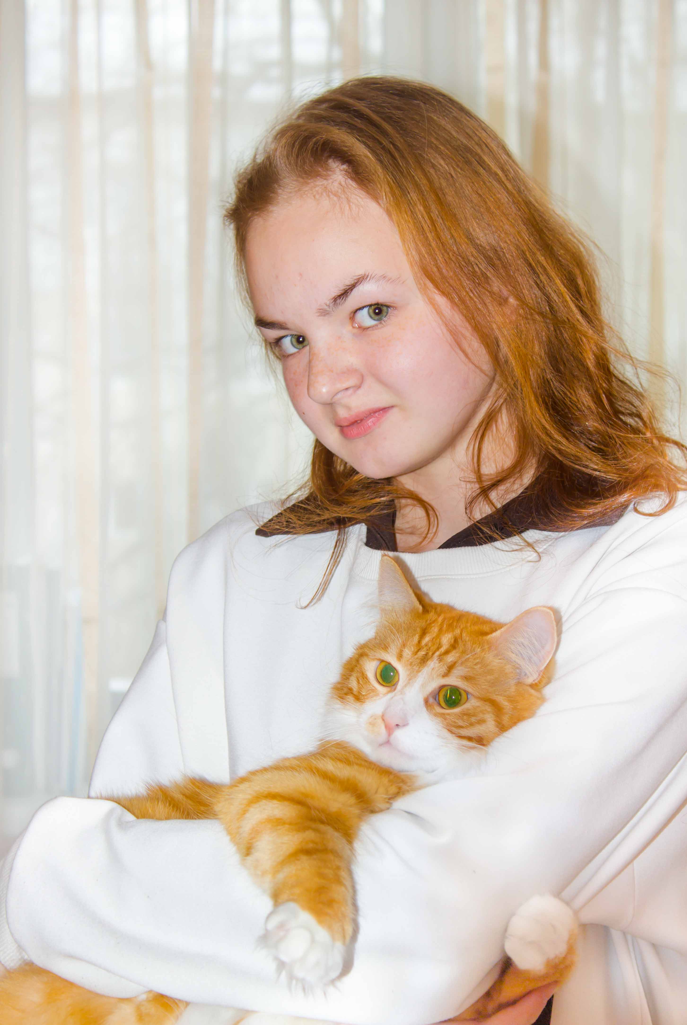 Неплохой снимок! Неплохо применили вспышку. Фотография получилась достаточно светлой и яркой. Неплохая резкость на лице девушки. Достаточно удачные позы у модели и кошки, хорошо поймали момент.
