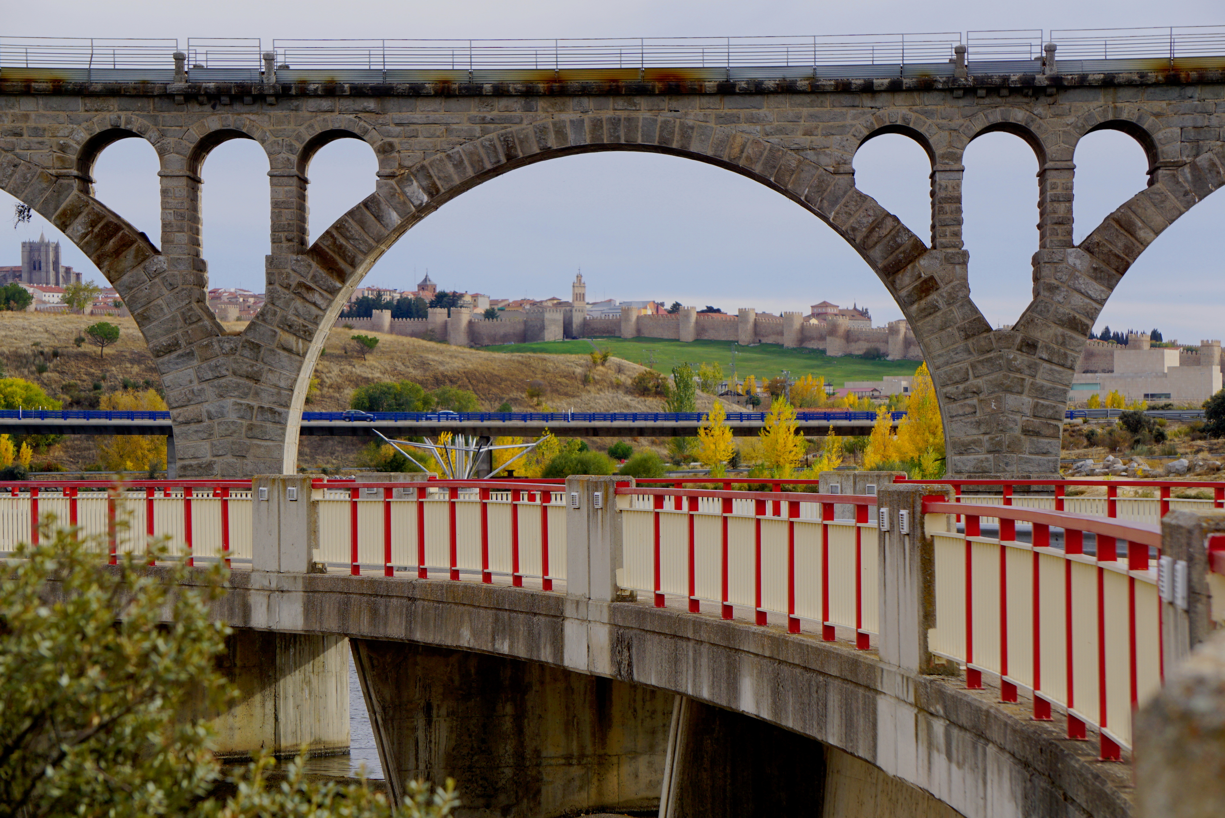 В этом снимке много ритмов: красные и серые столбики в ограде на переднем плане, опоры моста и арки в них, башни в крепостной стене на заднем плане. Но центральная полукруглая арка образует рамку, и мне кажется, что именно заключает в себе смысловой центр снимка: вид на старинный испанский город Авила. Колокольня в крепостной стене взламывает ритм и притягивает взгляд, хотя это самый дальний объект в пространстве кадра.
