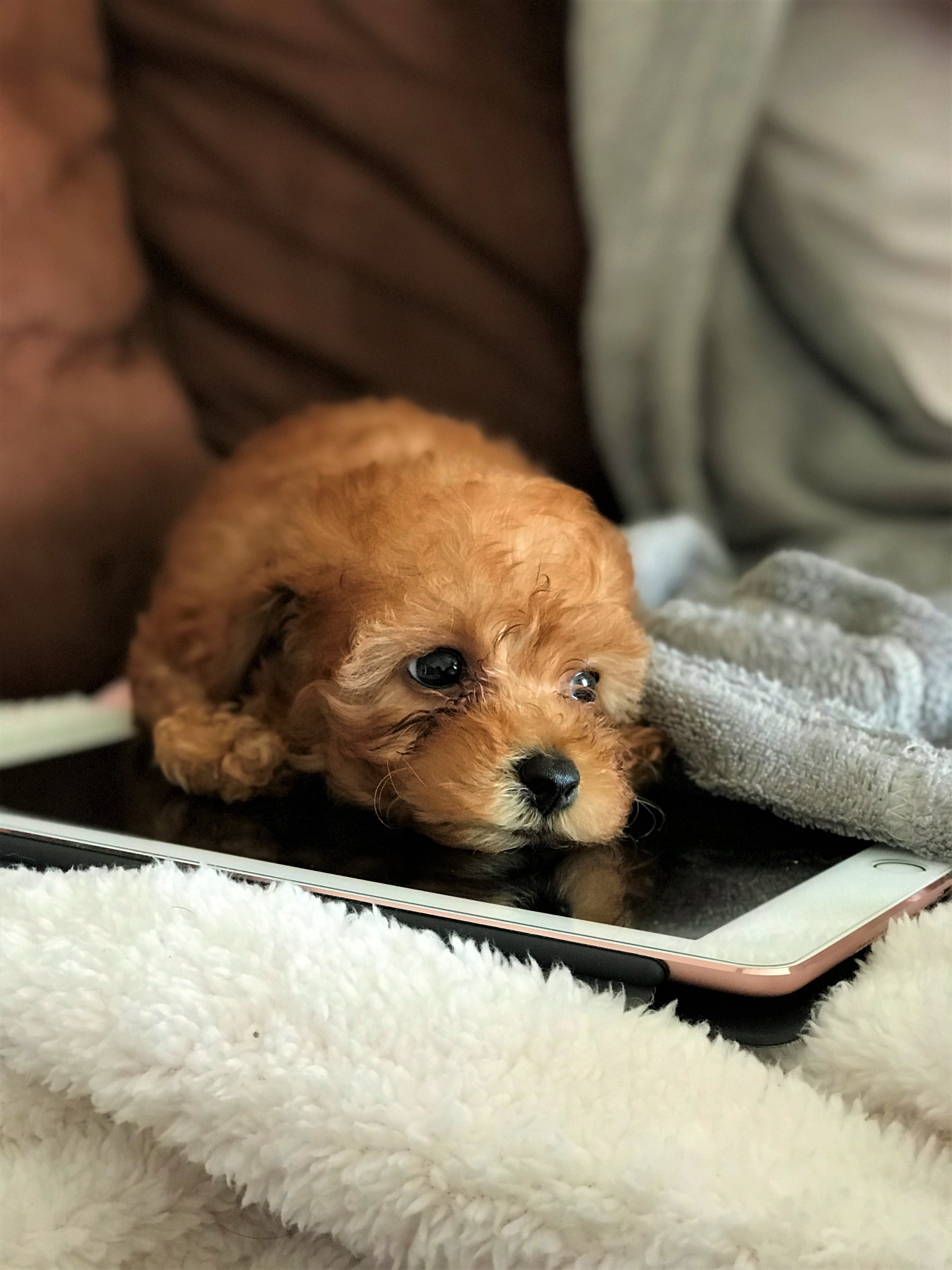 портретное фото щенка, акцент сделан на взгляде и отражении в планшете, есть пространство между границей кадра и глазами обьекта. я попыталась передать милось, нежность и немного грусти маленького щенка
