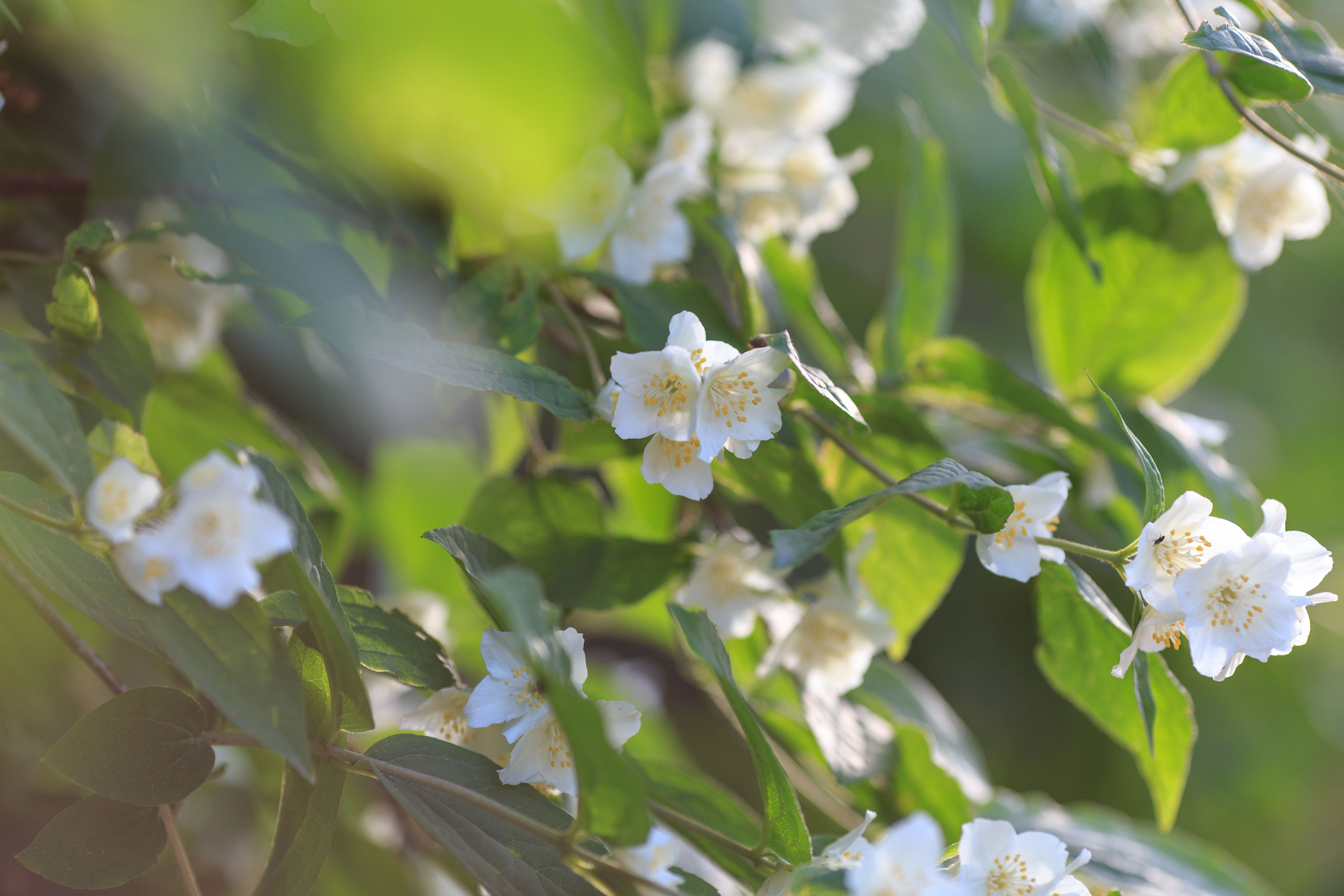 Диафрагма приоткрыта и использовано длинное фокусное расстояние объектива, поэтому глубина резкости получилась маленькая, размытый фон усиливает внимание на цветочках (1).