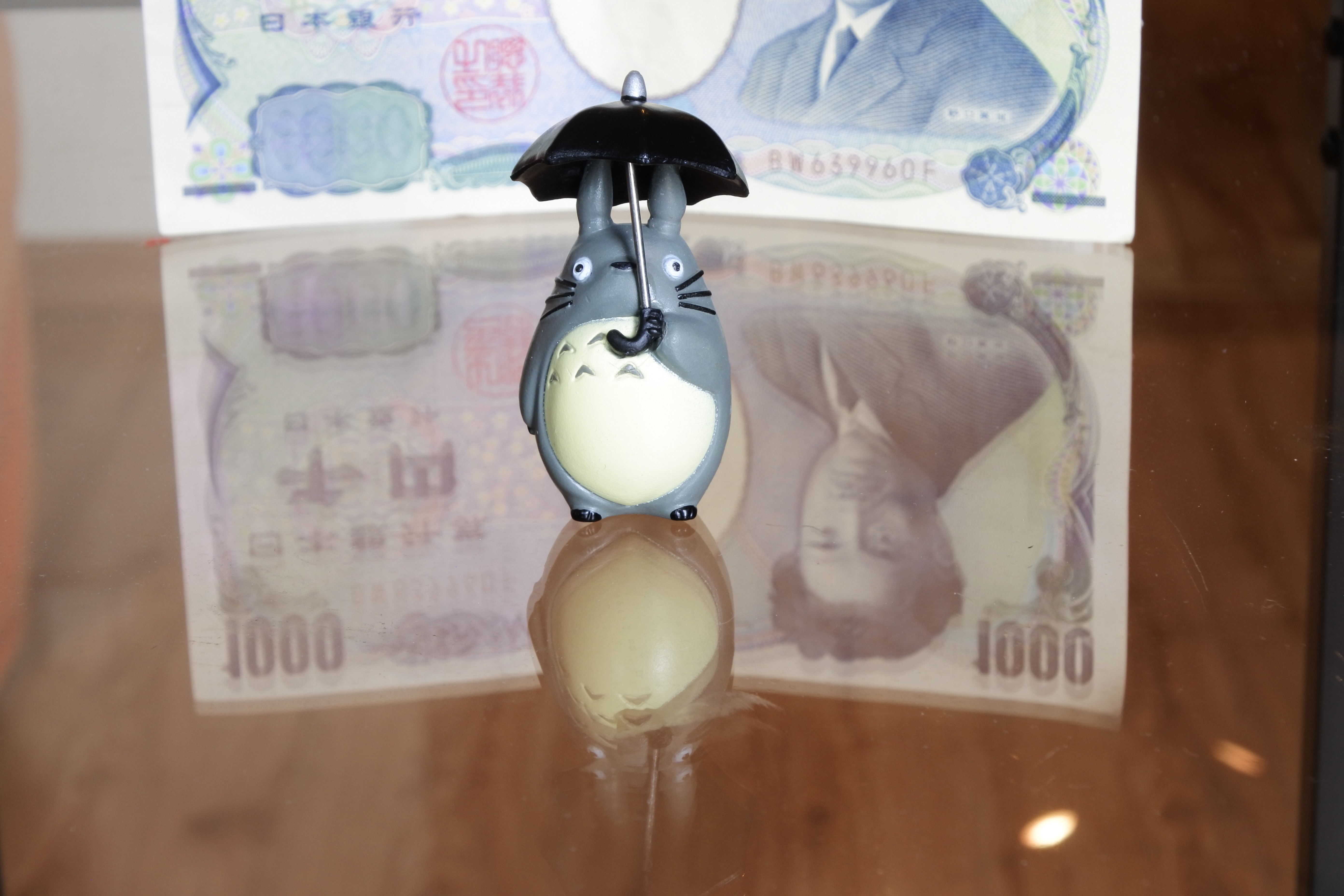 Неплохой кадр! Сделали снимок небольшой игрушки. Хорошо подобрали ракурс для съемки и создали интересный фон из банкноты. При этом удачно подобрана зеркальная поверхность стола, создавшая отражение снизу кадра.