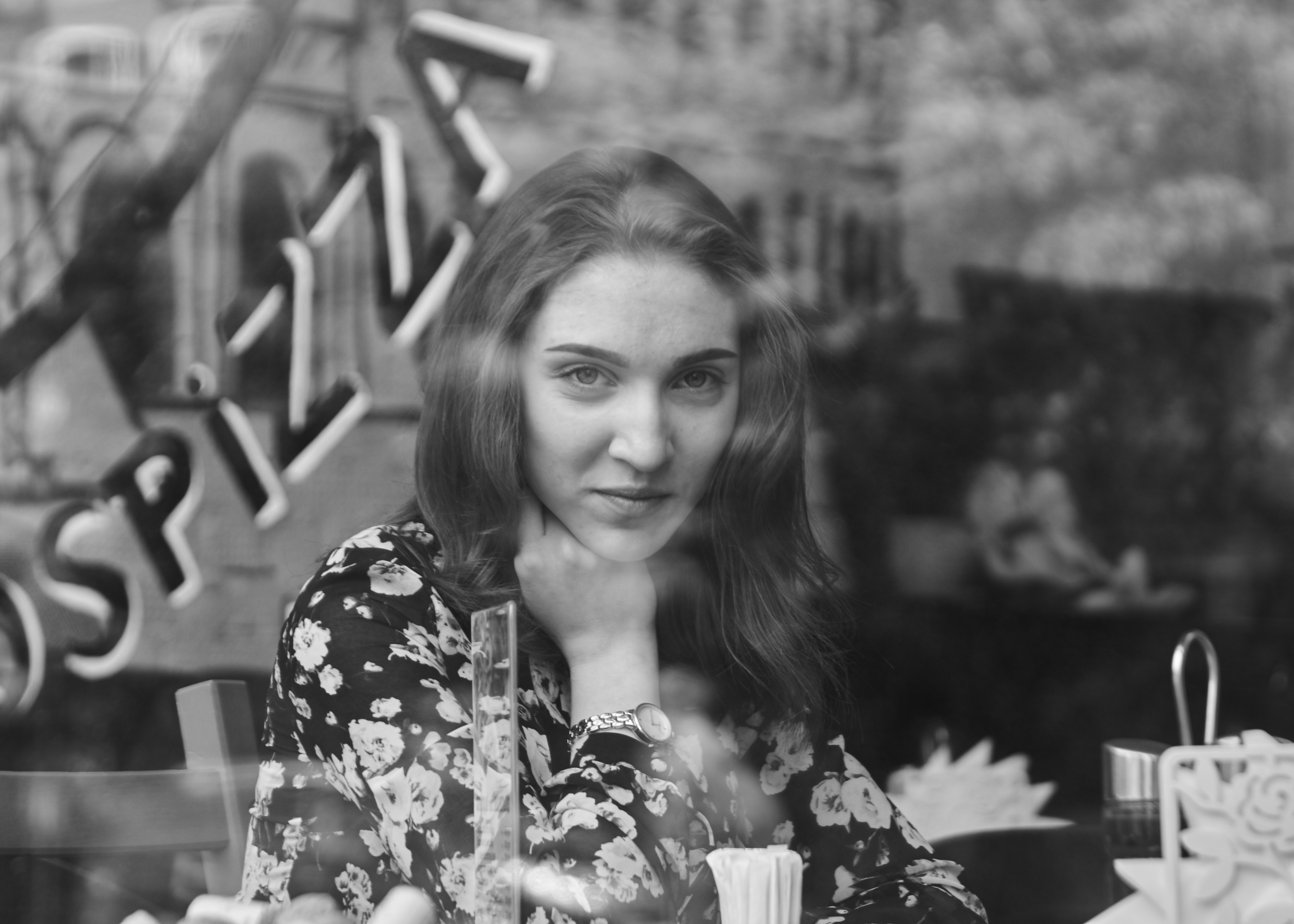 Фотографировал девушку в кафе. После нескольких десятков кадров внутри, решил сфотографировать ее через витрину с улицы. Специально выбрал такой ракурс. Решил перевести в ЧБ. Лично мне портреты в ЧБ кажутся более интересными.