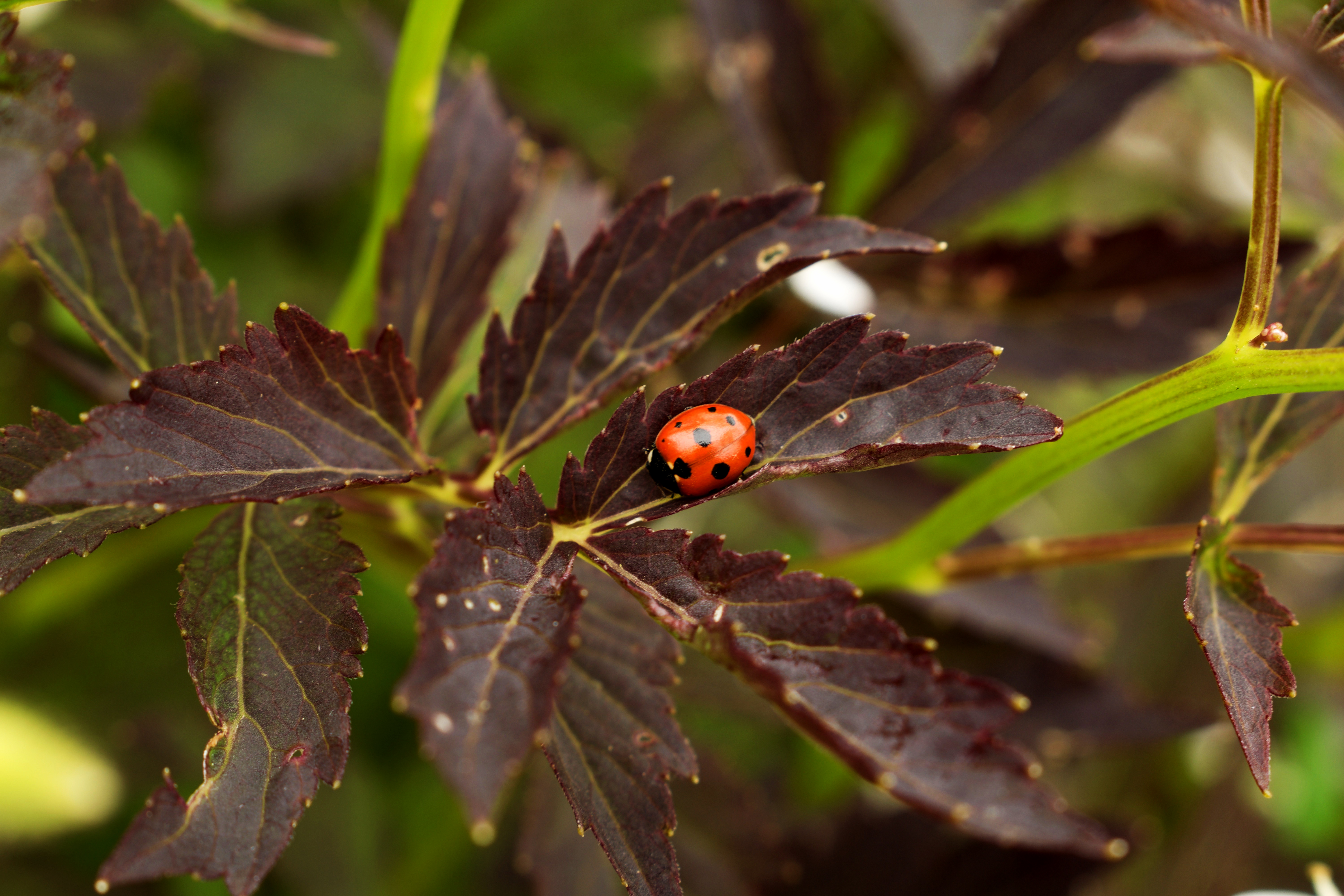 Яркий жучок сразу же привлекает внимание зрителя и это не удивительно, красный цвет в фотографии является самым сильным.