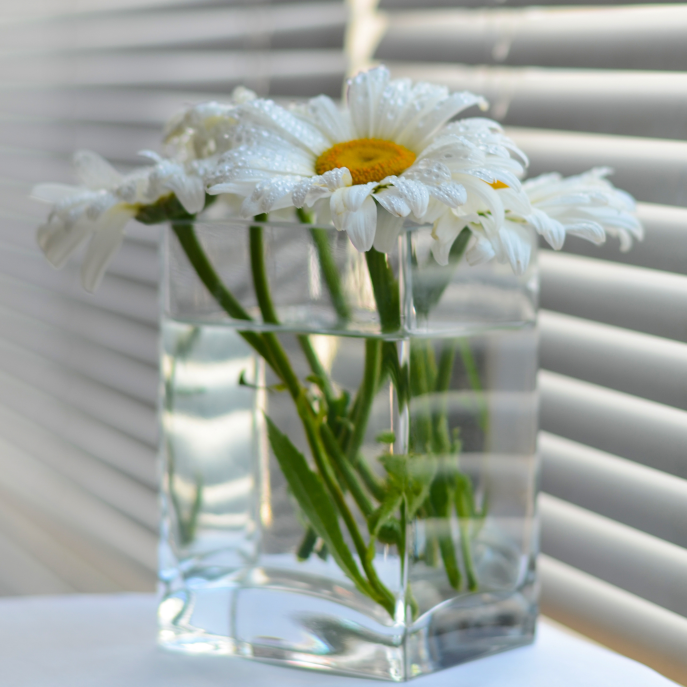 Неплохой кадр! Сделали снимок ярких ромашек на фоне окна. При этом само окно закрыто при помощи жалюзи и свет получился мягким и рассеянным. Ручные параметры подобраны неплохо и позволили добиться хорошей яркости и белизны объектов в кадре. Уходящие вглубь кадра полоски жалюзи придают сниму объем.