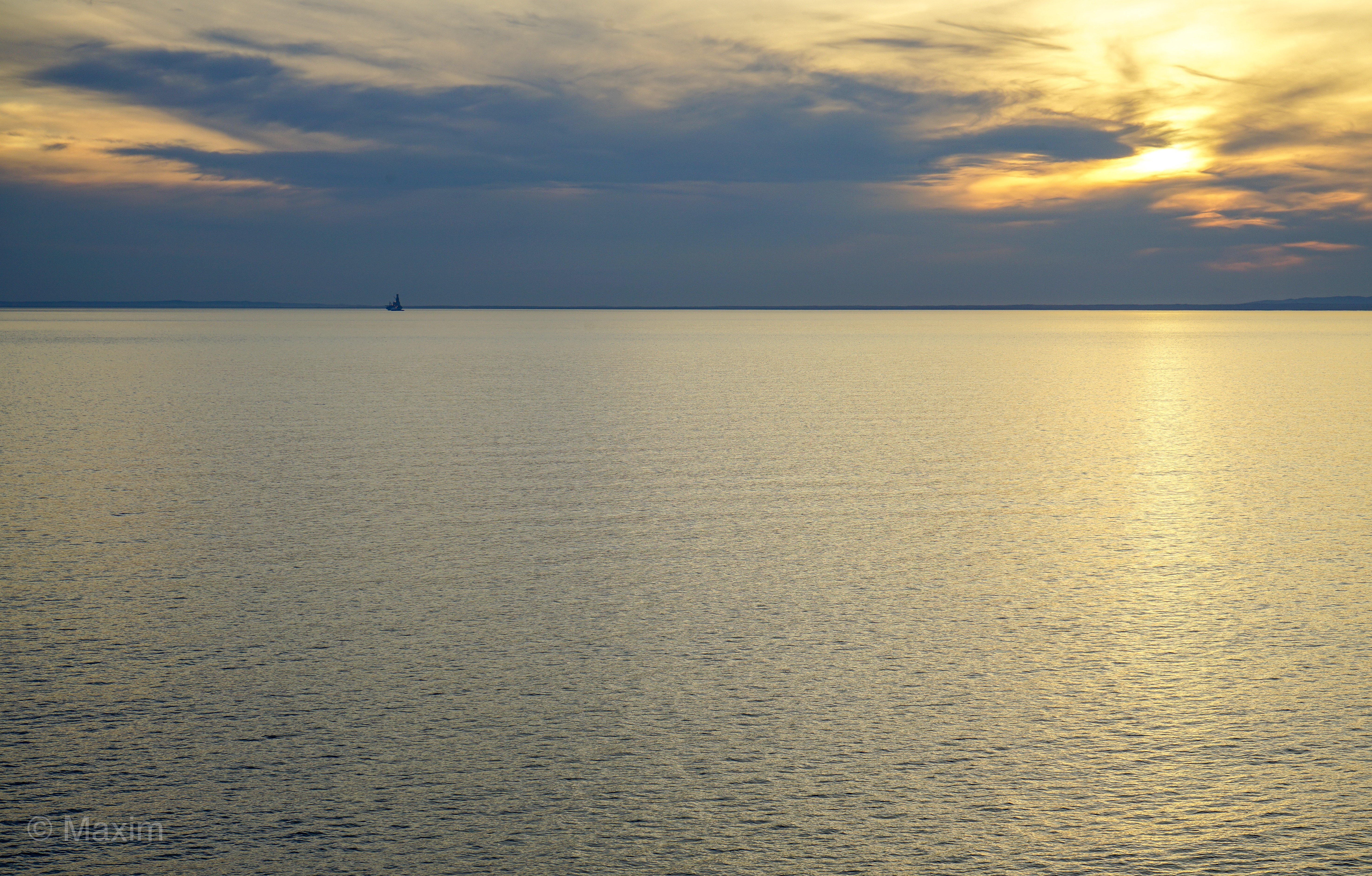 Хороший кадр! Сделали снимок минималистичного пейзажа. Показали красивое море с низким теплым светом солнца. Удалось передать красивое небо с эффектными облаками. Грамотно подняли линию горизонта от центра кадра, уделив больше внимания фактурной поверхности воды с легкой рябью. Небольшая вышка или корабль на заднем плане придает кадру небольшой акцент.