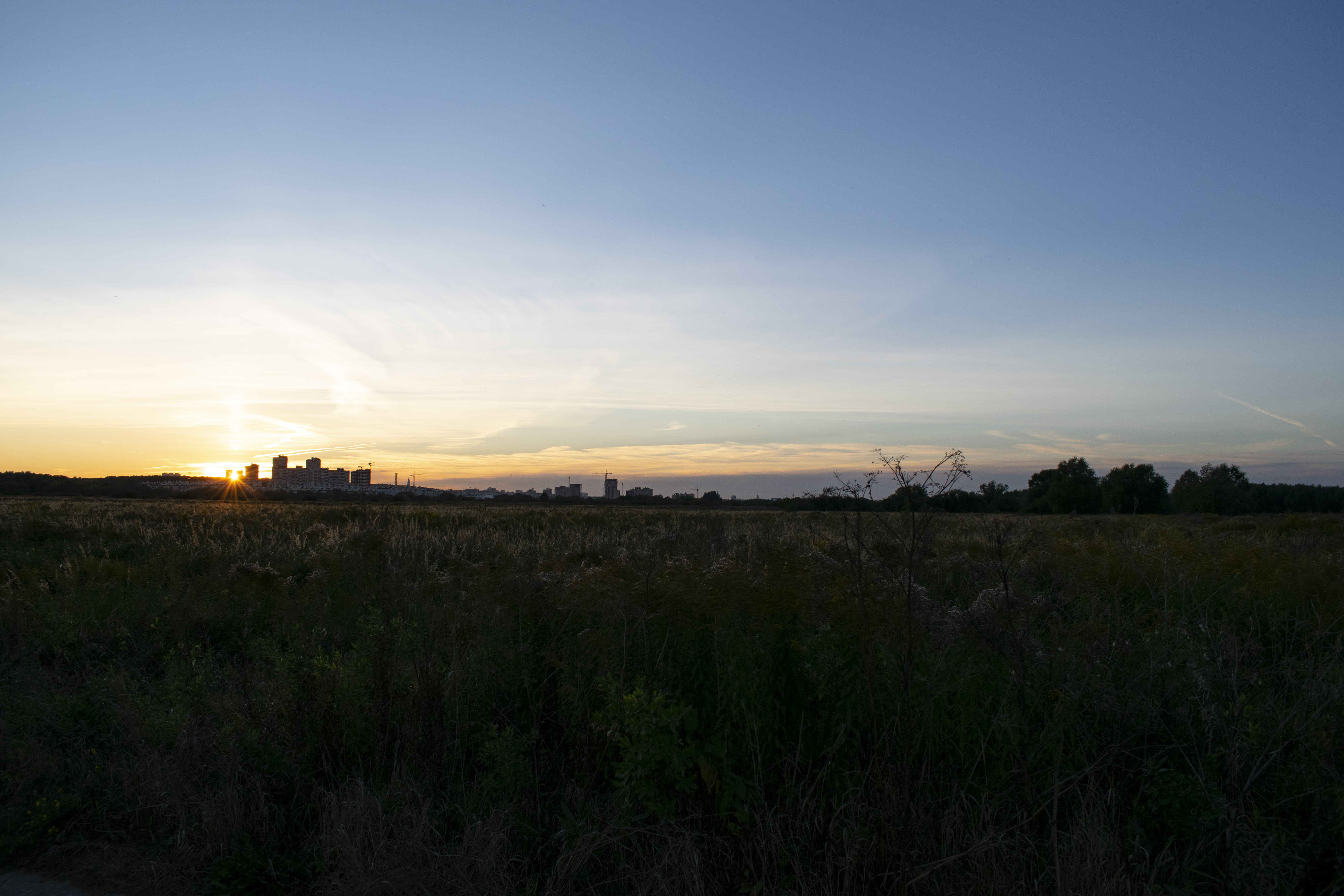 Неплохой кадр! Сделали снимок красивого вечернего пейзажа с заходящим солнцем. Неплохо поймали момент, когда солнце почти скрылось за горизонтом. Параметры подобраны корректно и обеспечили хорошее качество кадра.