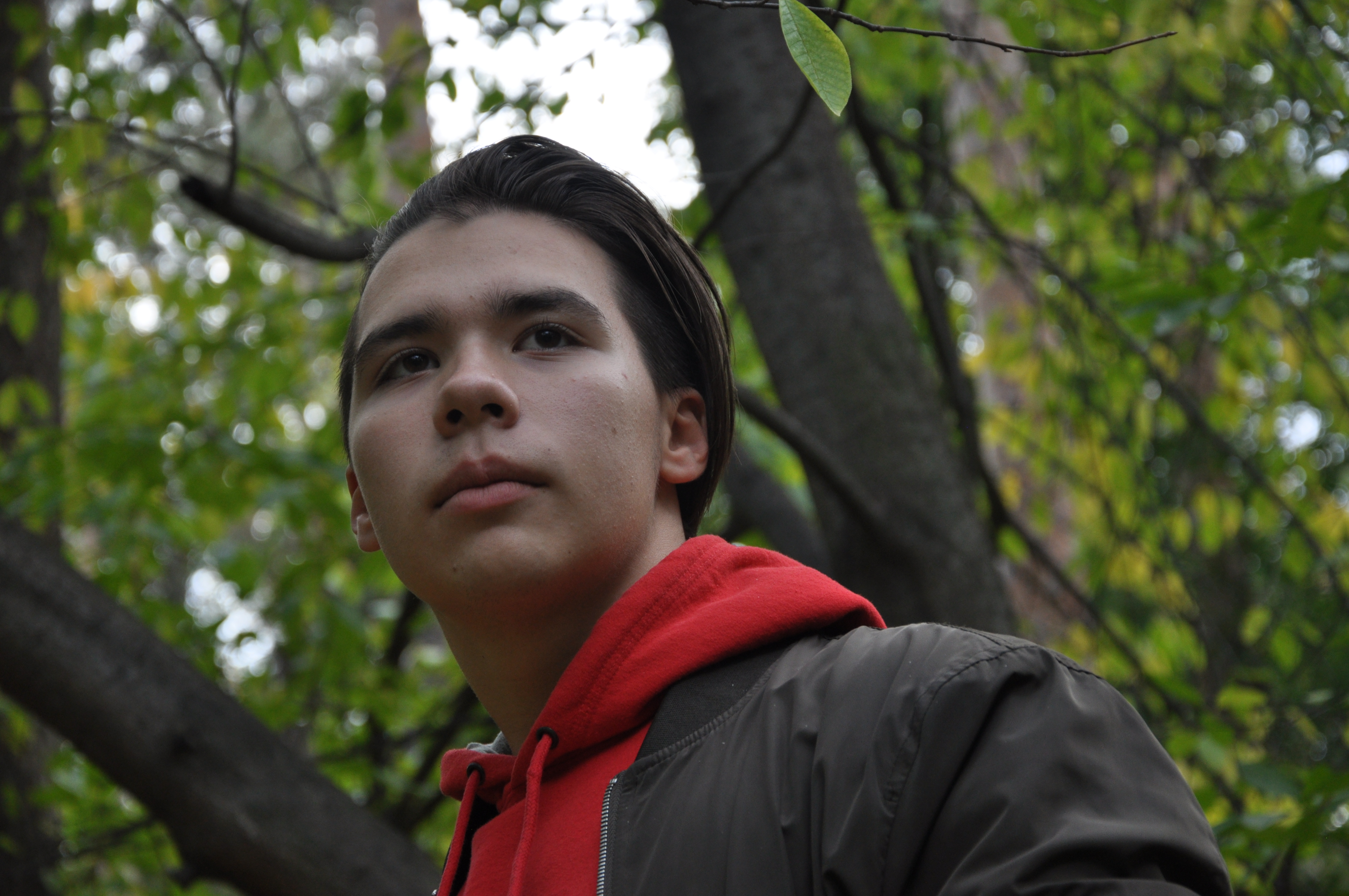 Неплохой кадр! Сделали снимок поплечного портрета на природе. Выбрали не совсем обычный ракурс снизу вверх. За счет большого фокусного расстояния и не сильно закрытой диафрагму удалось получить неплохое боке на заднем плане, добавив снимку объем.