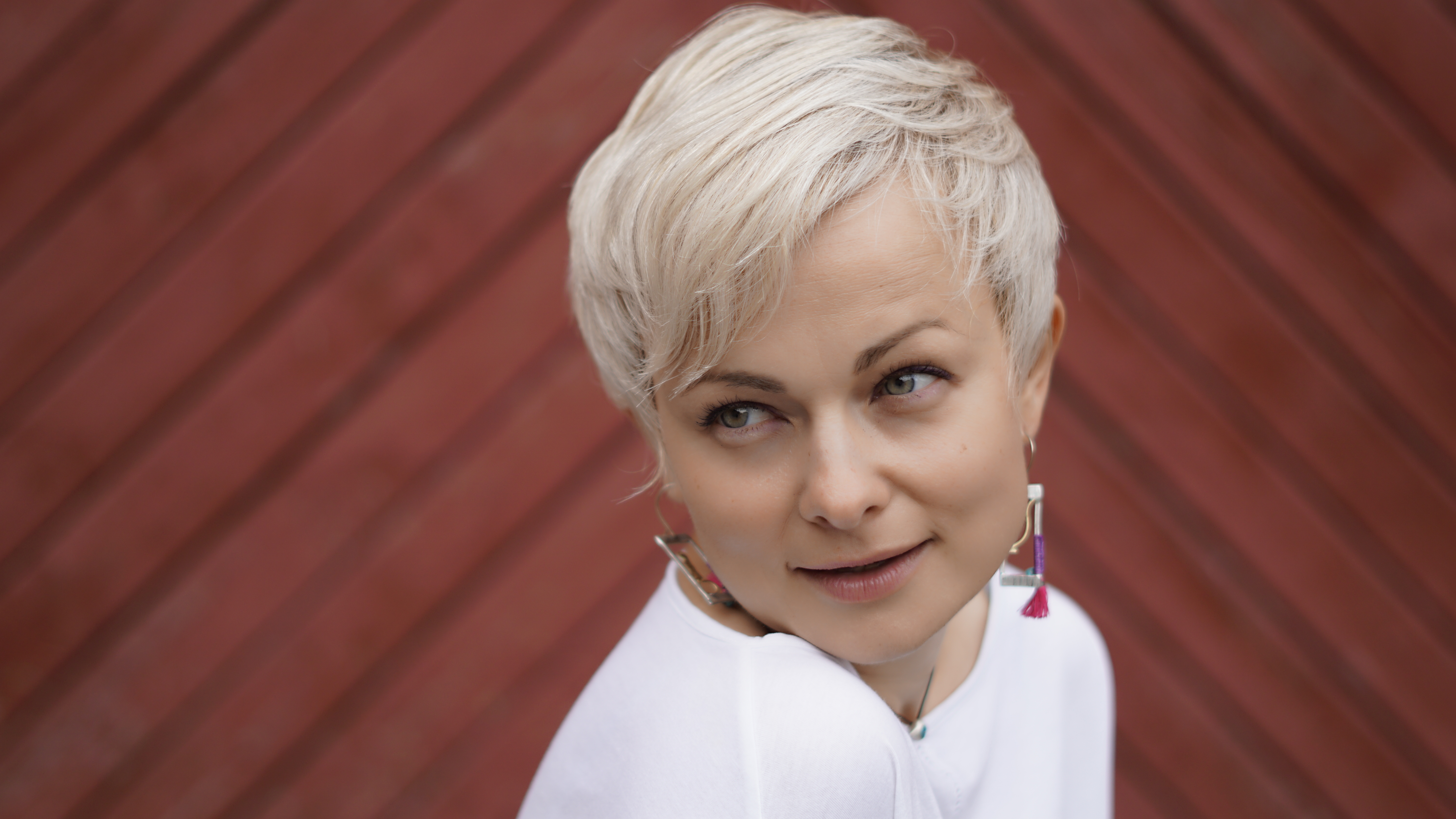 Мне нравится эта работа цветовым контрастом модели и фона, и то, что линии на фоне сходятся за спиной модели, как бы делая акцент на ней, доказывая ее важность. Это похоже на указатель, на стрелку: смотрите, вот он -- центр кадра! Мы снимали этот портрет ранним пасмурным, освещение естественное, рассеянный жемчужный свет.