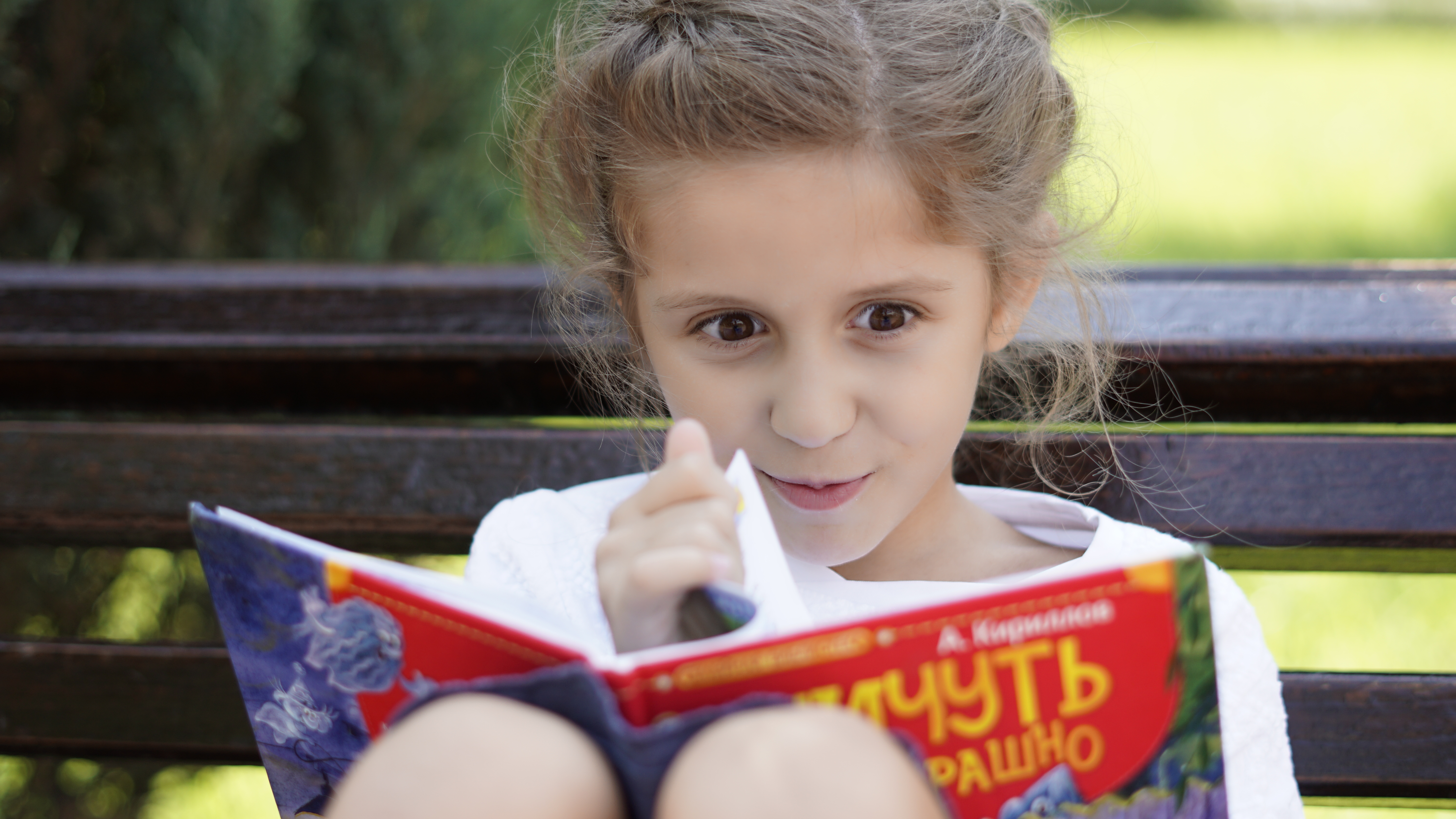 Девочка читает книгу на скамейке в парке, и в его глазах увлечённость, восторг и наслаждение.