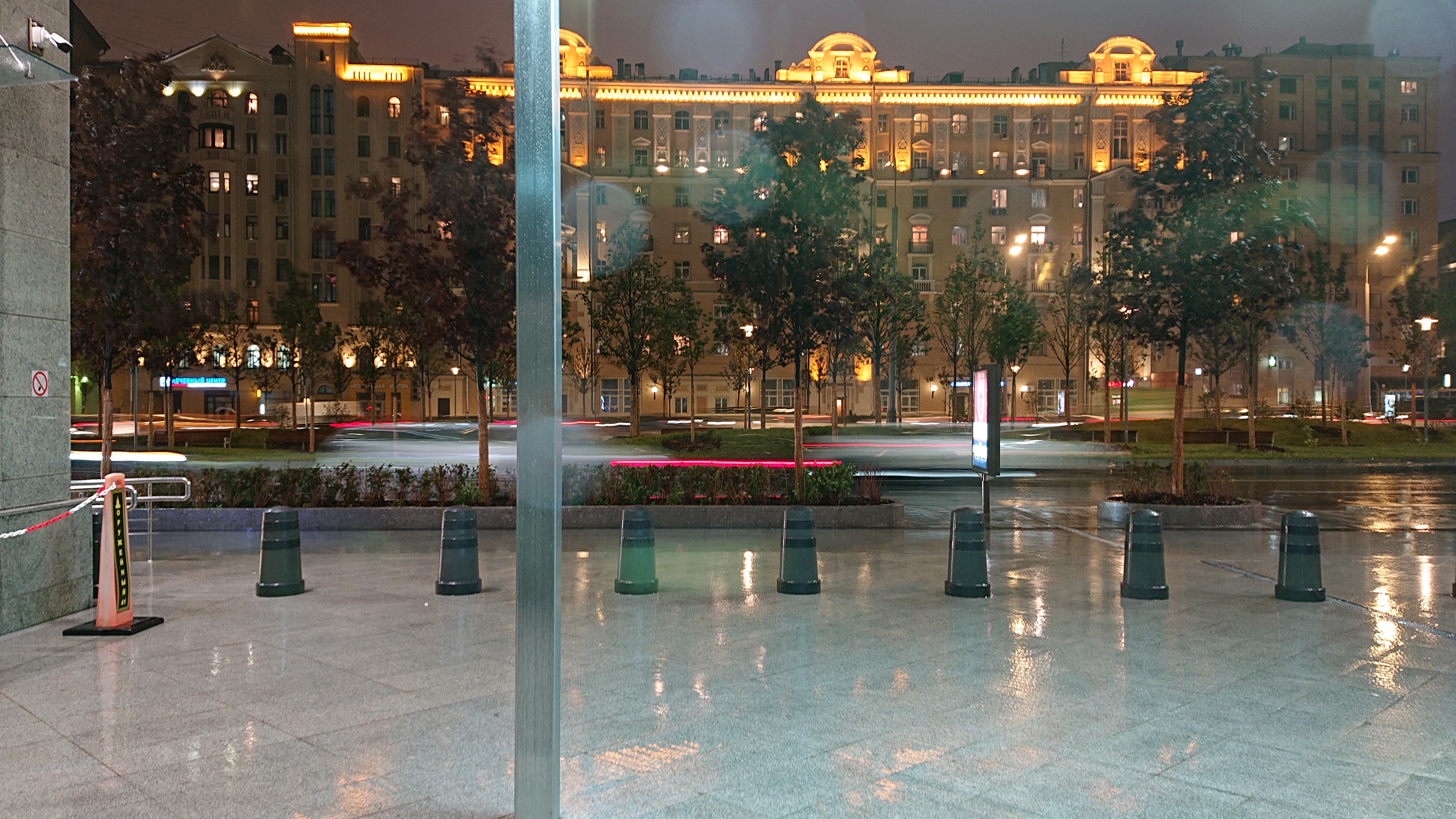 Чтобы сделать длинные световые следы я сначала увеличил выдержку до 1 секунды. Результат оказался пересвеченным. Экспокоррекцию делать не стал, а уменьшил выдержку до 0.5 секунды. Чтобы зафиксировать телефон приложил его к стеклу - в результате добавились приятные блики.