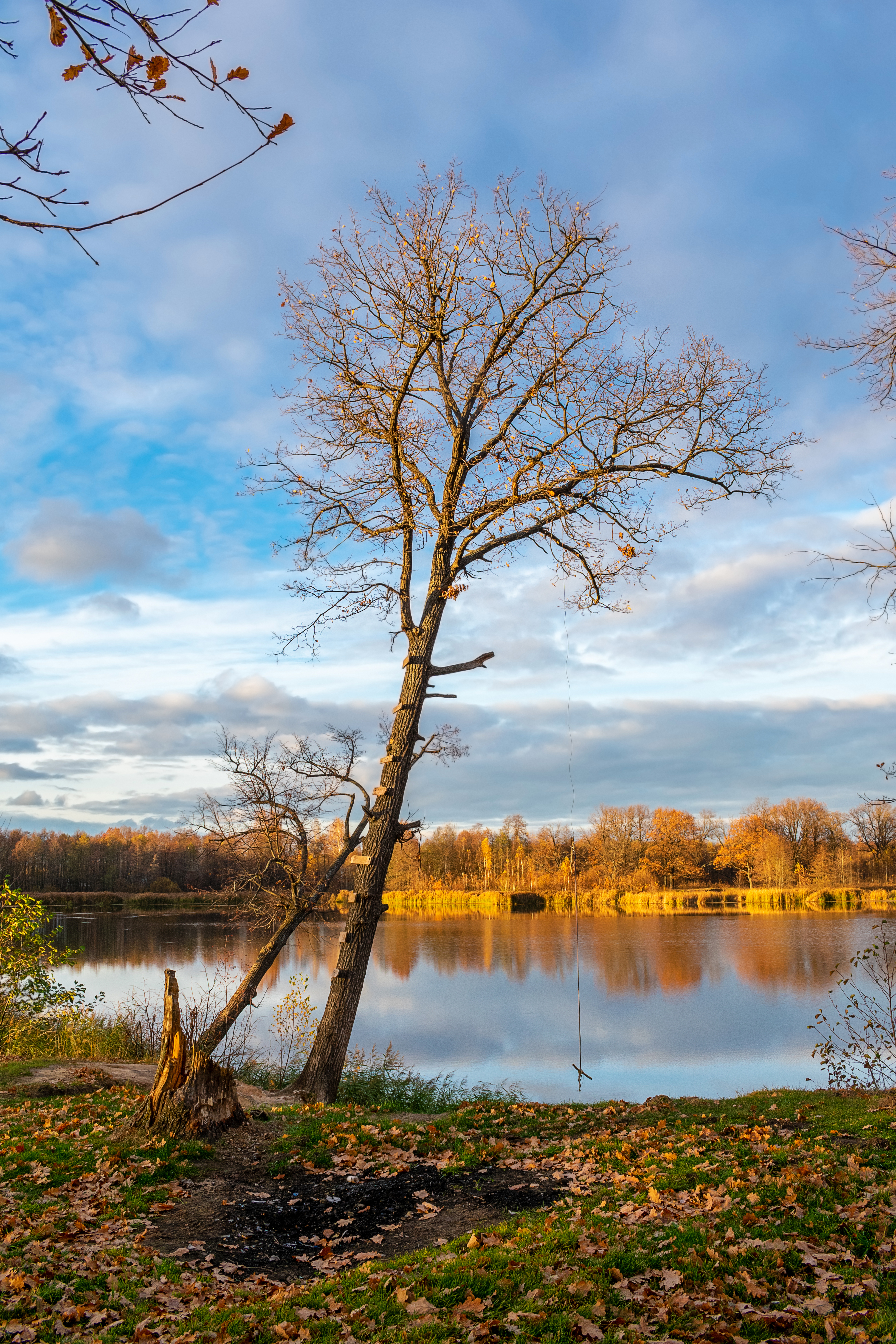 Хороший кадр! Сделали снимок красивого осеннего пейзажа. Выбрали фактурное дерево в качестве главного объекта съемки. Использовано широкоугольное фокусного расстояния, с его применением детали раздвигаются, увеличивается передний план, а задний становится более маленьким и далеким, таким объективом получается хорошо подчеркнуть линейную перспективу. Удачно поймали момент с теплым освещением от низкого солнца в кадре.