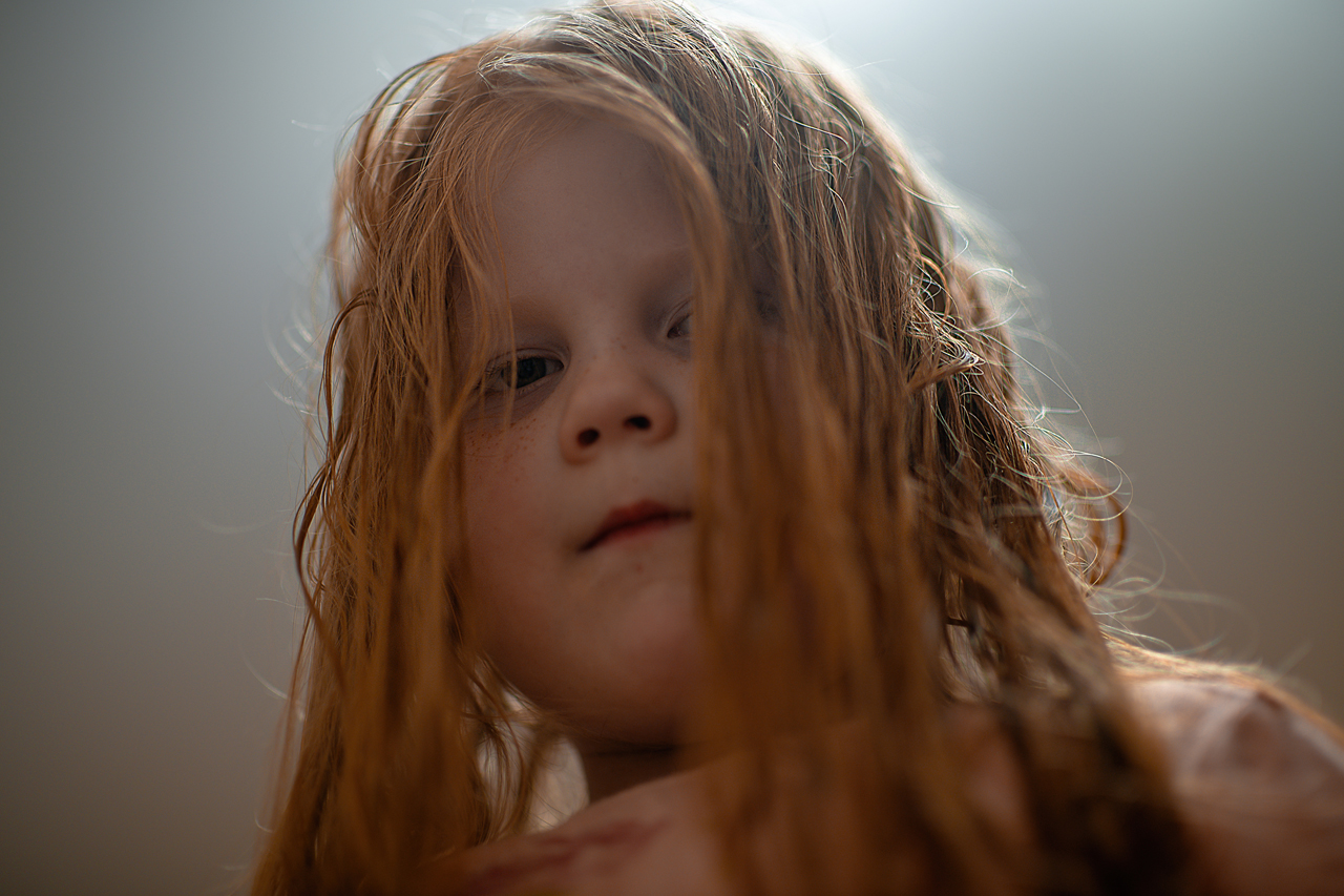 Нестандартный детский портрет получился у Вас! Интересную точку съемки выбрали и использовали в качестве контрового света источник на потолке. Резкость в нужном месте, хотя глубина резкости очень маленькая. Интересное цветовое решение кадра.