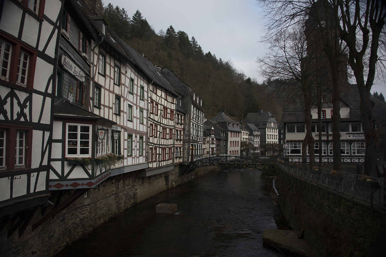 Для задания "Осветление теней". Зимний деревенский пейзаж (немецкая деревня Моншау). Использовала самый простой способ - сдвиг влево среднего ползунка в "уровнях". Фотография потеряла контрастность, но зато проявились детали в затемненных участках (исходная фотография была снята в формате RAW).