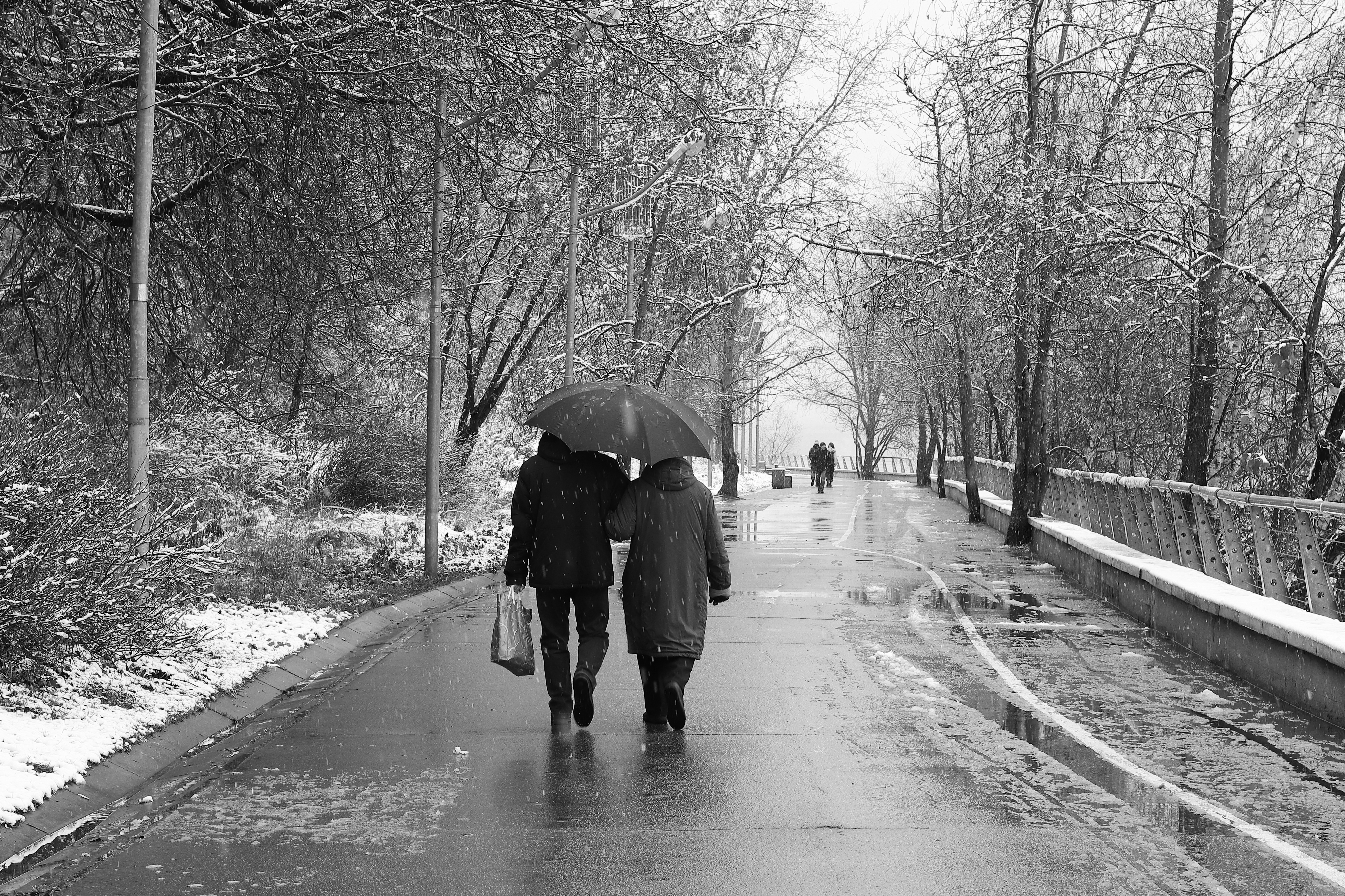 Акцент сделан на пару под зонтиком. Хорошо читается направление их движения.