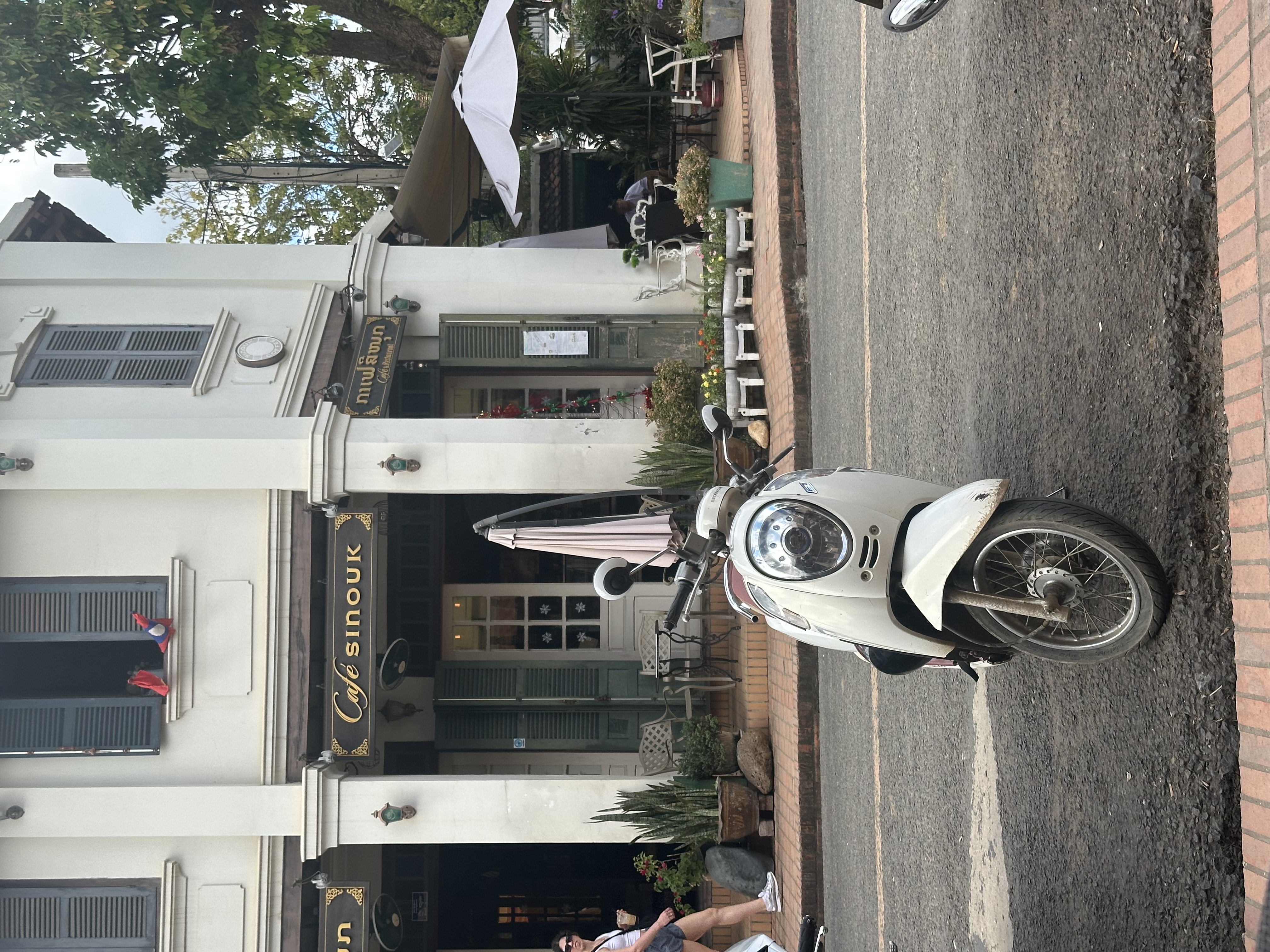 В переднем плане выделяется мопед, он становится зрительным центром. Далее взгляд плавно перемещается к зданию. Кадр уютный и теплый.