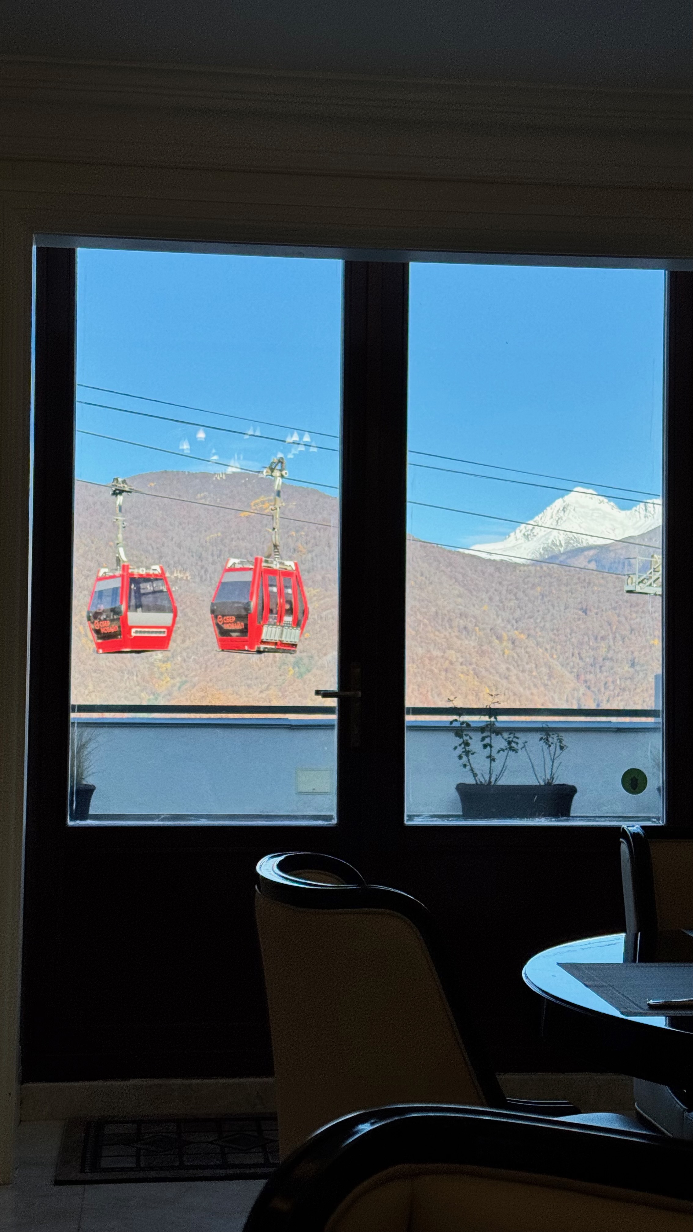 Окно в фоне делает композицию симметричной. Яркие вагончики подъёмника отлично выделяются в окошке. Они становятся зрительным центром.